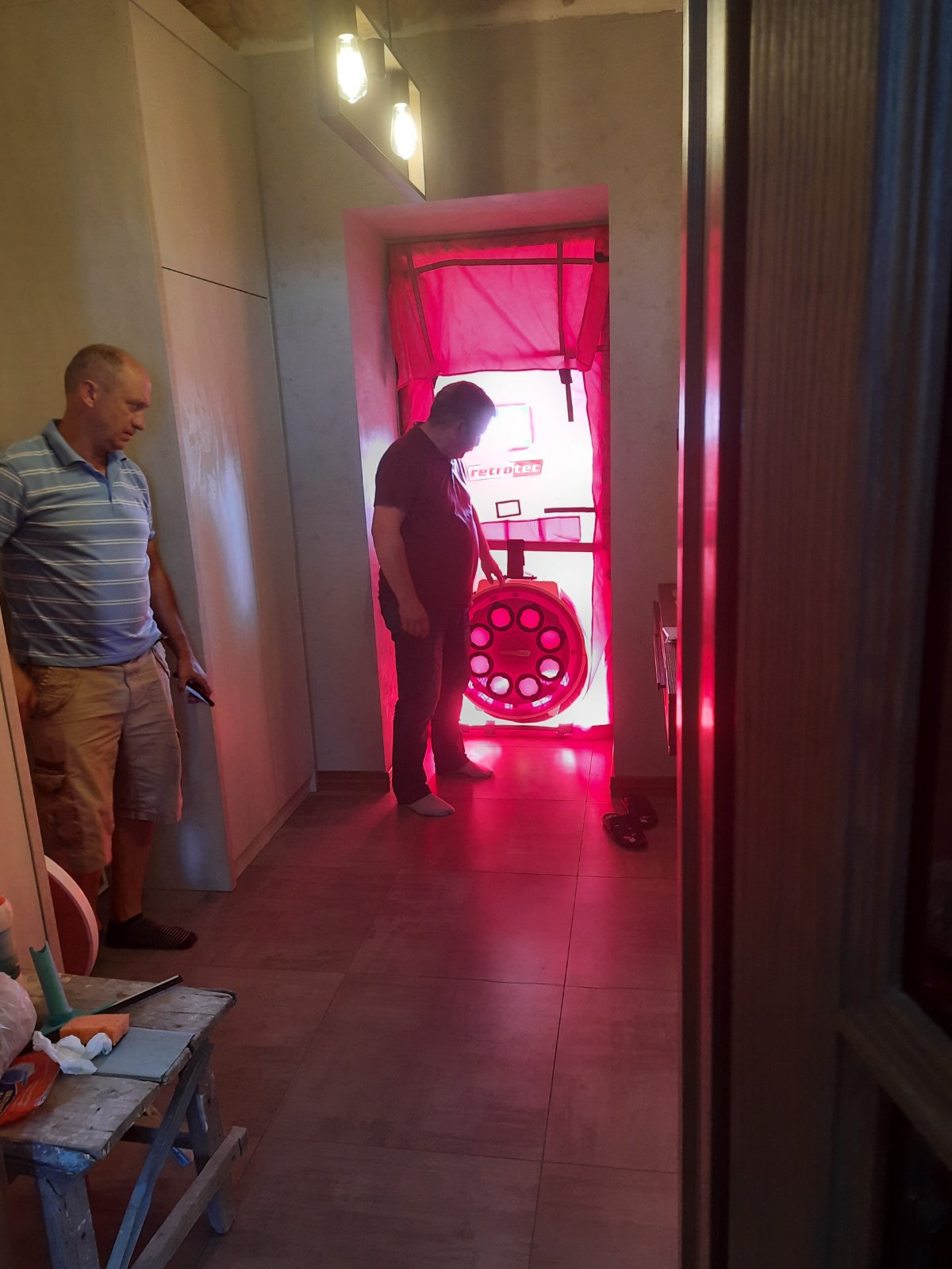 Обстеження проводили представники компанії Термоконтроль-Україна ТОВ, яка виконує перевірку якості виконаних будівельних робіт за допомогою тесту на герметичність будівель. Компанія має в своєму розпорядженні обладнання світового лідера даної галузі компанії Retrotec (США). Обладнання має метрологічну повірку, працівники проходять навчання та мають відповідні сертифікати, що дають право працювати з обладнанням Retrotec. Тест проводився у вже готовому приватному будинку, за результатами обстеження були виявлені деякі недоліки, що пов’язані з ущільненням вікон та дверей, а також було виявлено фільтрацію повітря через шахту для інженерних комунікацій, що означає неякісну герметизацію уводу комунікацій. Зважаючи на те, що виявлені недоліки незначні, будинок відповідає всім вимогам державних будівельних норм, побудований з використанням сучасних енергозберігаючих технологій.