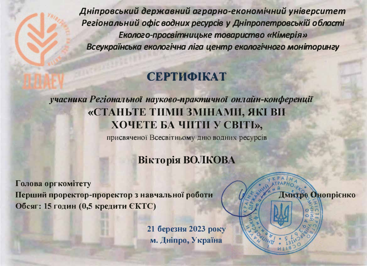 К Всесвітньому дню водних ресурсів у м.Дніпро пройшла Регіональна науково-практична онлайн-конференція "Станьте тими змінами, які ви хочете бачити у світі". Вітаємо учасників конференції із отриманням сертифікатів!