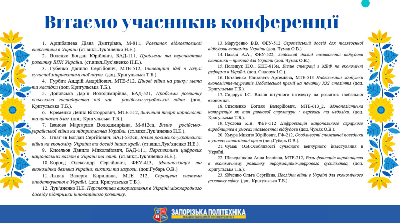 Учасники конференції обговорили широкий спектр питань, пов’язаних з перспективами і можливостями повоєнного відновлення в Україні. Доповідачами було проведено аналіз економічних стратегій для відновлення економіки України після війни; обговорено інвестиційні можливості розвитку малого та середнього бізнесу, роль політичних реформ та стабільності у відновленні країни, вплив міжнародної підтримки та співпраці, перспективи відновлення соціальної інфраструктури, освіти, культури, а також психологічна реабілітація і інтеграція ветеранів і населення.