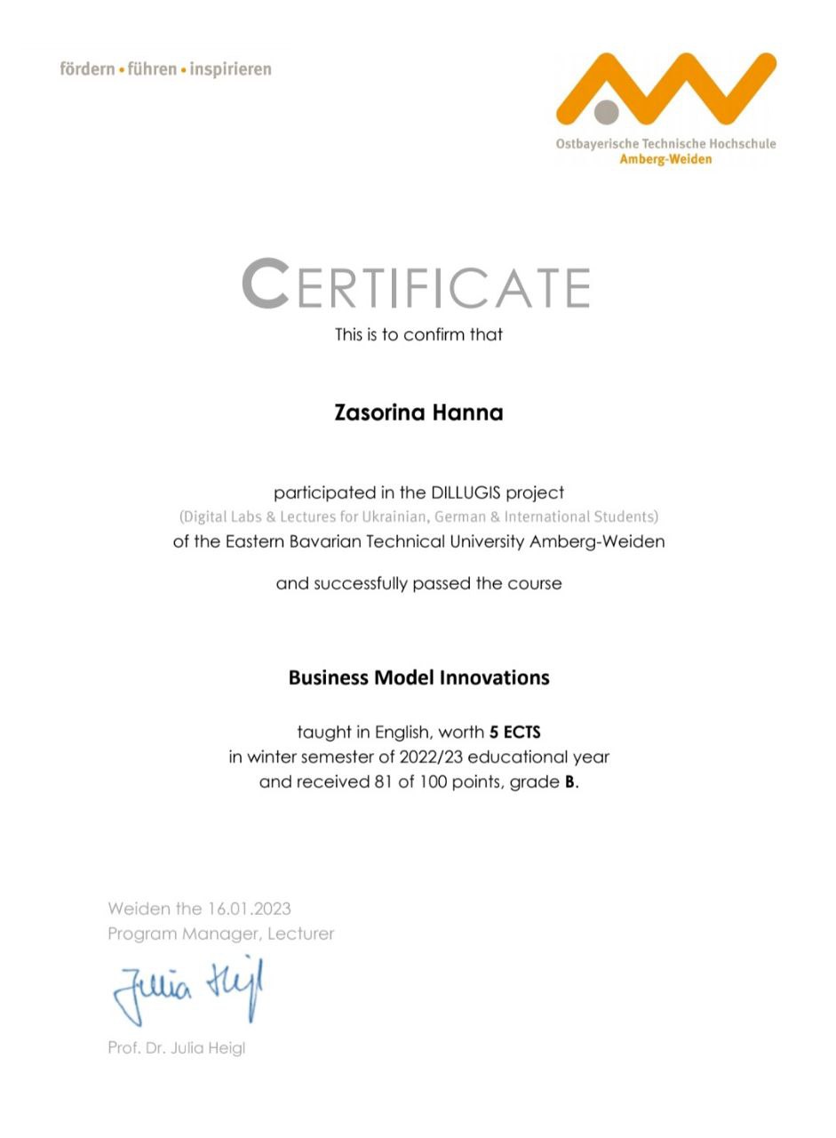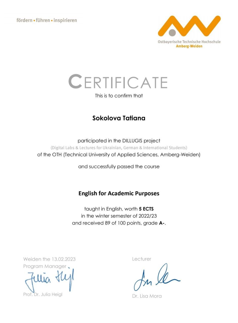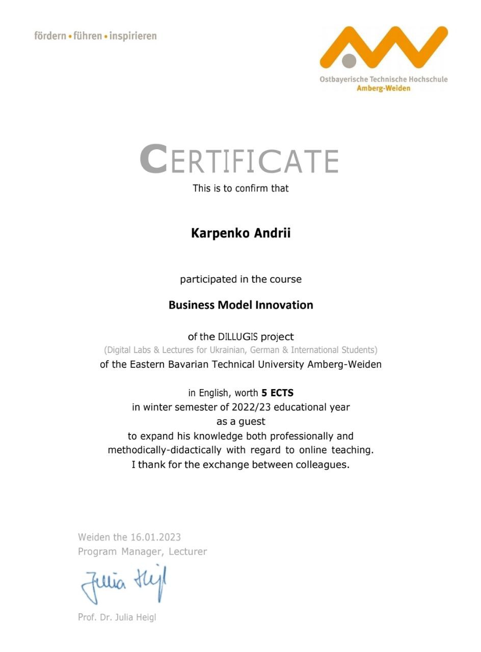 Щиро вітаємо студентів і викладачів НУ «Запорізька політехніка» Карпенка А. В., Засоріну Г., Соколову Т., Соляну Т., Попадинець А., Чередніченко К., з успішним завершенням навчання за окремими курсами освітньої програми «Digital Technology and Management» Східно-Баварського університету Амберг-Вайден в рамках реалізації проєкту DILLUGIS (Digital Labs & Lectures for Ukrainian, German & International Students) і одержанням сертифікатів міжнародної академічної мобільності.