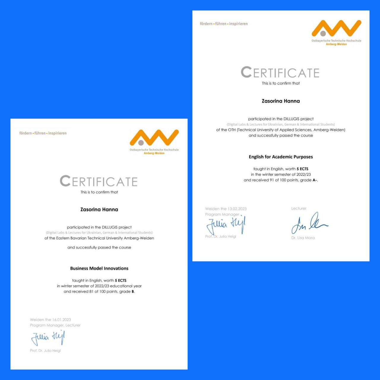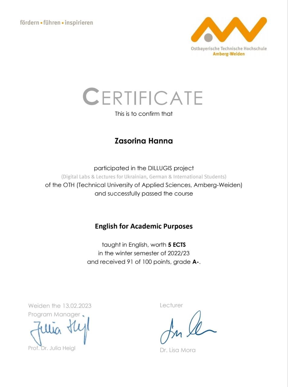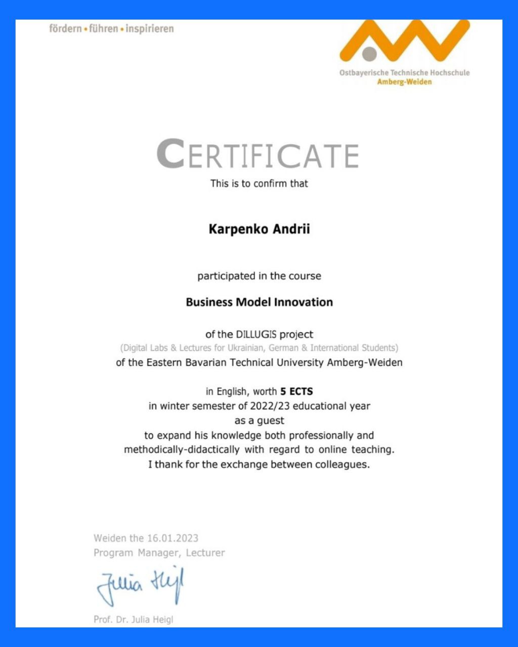 Щиро вітаємо студентів і викладачів НУ «Запорізька політехніка» Карпенка А. В., Засоріну Г., Соколову Т., Соляну Т., Попадинець А., Чередніченко К., з успішним завершенням навчання за окремими курсами освітньої програми «Digital Technology and Management» Східно-Баварського університету Амберг-Вайден в рамках реалізації проєкту DILLUGIS (Digital Labs & Lectures for Ukrainian, German & International Students) і одержанням сертифікатів міжнародної академічної мобільності.