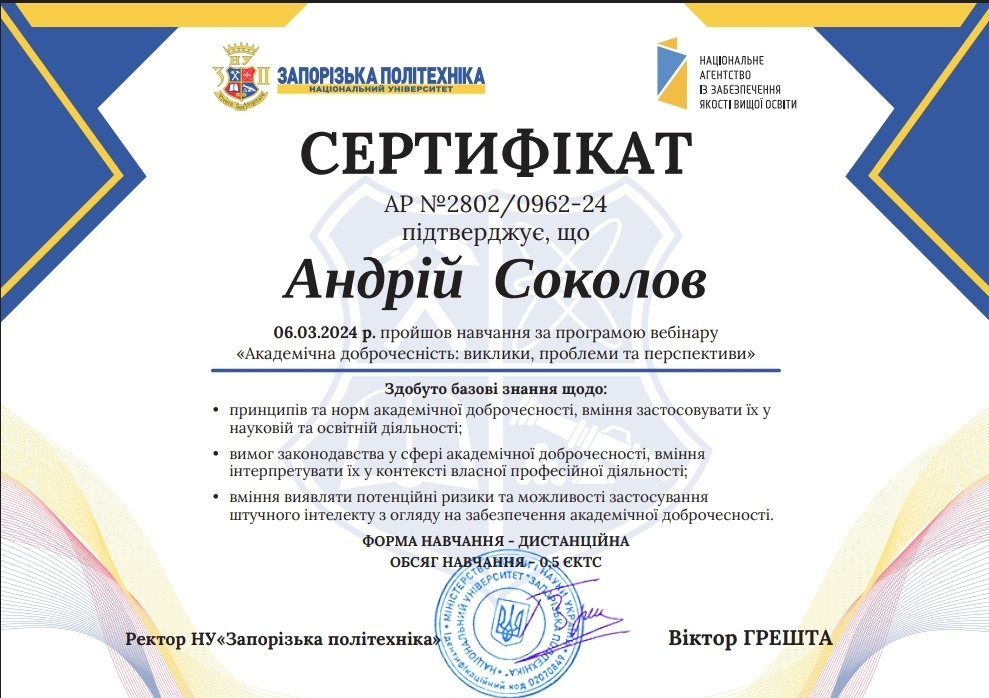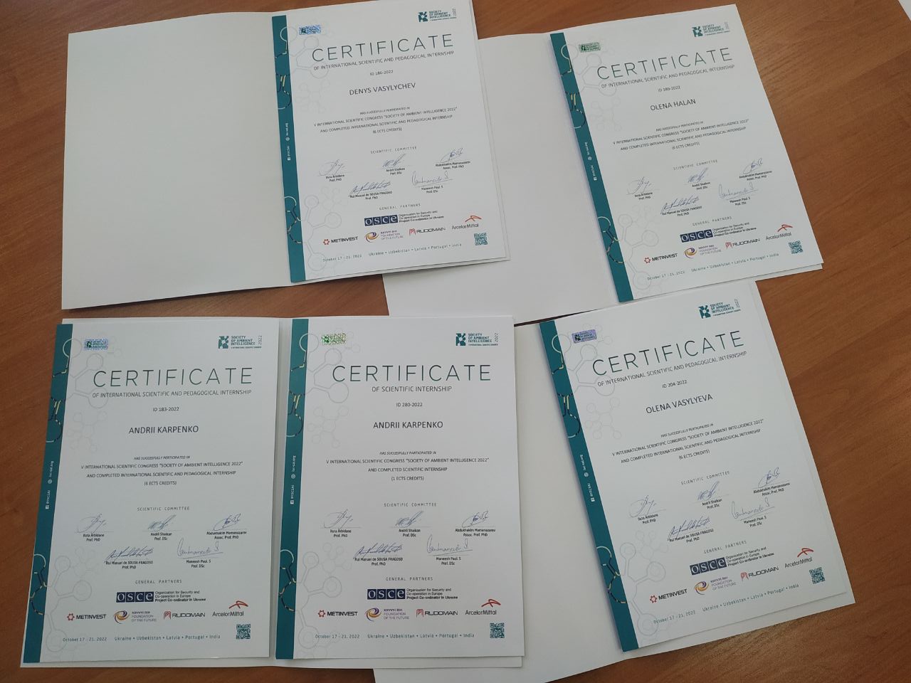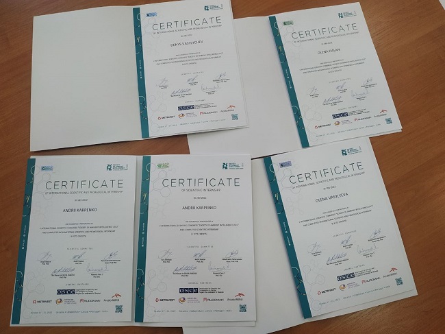 Викладачі кафедри професор Карпенко А.В., декан факультету МТЕ, доцент Васильєва О.О., доцент Василичев Д.В., доцент Галан О.Є. успішно завершили науково-педагогічне стажування у в V Міжнародний науковий конгрес «Society of Ambient Intelligence» (Україна – Узбекистан –Латвія – Португалія – Індія) на тему «Сучасні методи науково-дослідної та освітньої діяльності: міжнародний досвід та глобальні тенденції» в обсязі 6 кредитів ECTS (180 годин) та отримали відповідні сертифікати.