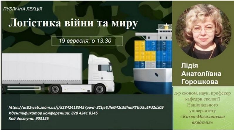 19 вересня 2022 року у НаУКМА відбулася публічна лекція на тему: «Логістика війни та миру». Лектор: докторка економічних наук, доцент, професор кафедри екології НаУКМА Лідія Горошкова.