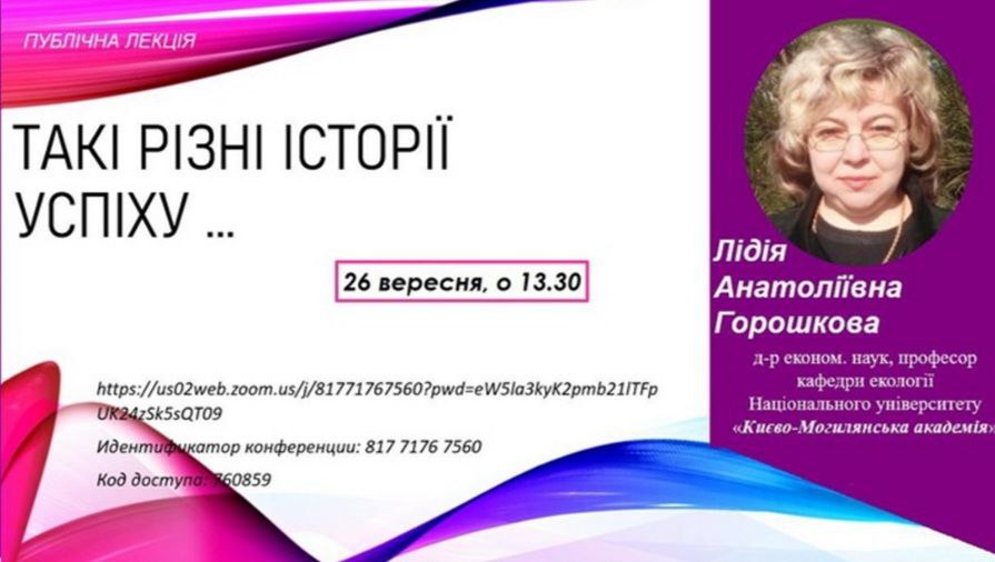 26 вересня 2022 року у НаУКМА відбулася публічна лекція на тему: «Такі різні історії успіху…». Лектор: докторка економічних наук, доцент, професор кафедри екології НаУКМА Лідія Горошкова.