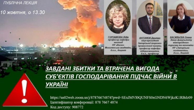10 жовтня 2022 року у НаУКМА відбулася публічна лекція на тему: «Завданя збитки та втрачена вигода суб’єктів господарювання під час війни в країні». Лекцію провели відразу три викладачі: Лідія Горошкова, професорка кафедри екології Національного університету «Києво-Могилянська академія»; Дмитро Антонюк, віце-президент Запорізької торгово-промислової палати, доктор економічних наук, професор; Олена Васильєва, декан факультету міжнародного туризму та економіки Національного університету «Запорізька політехніка», докторка економічних наук, доцентка.
