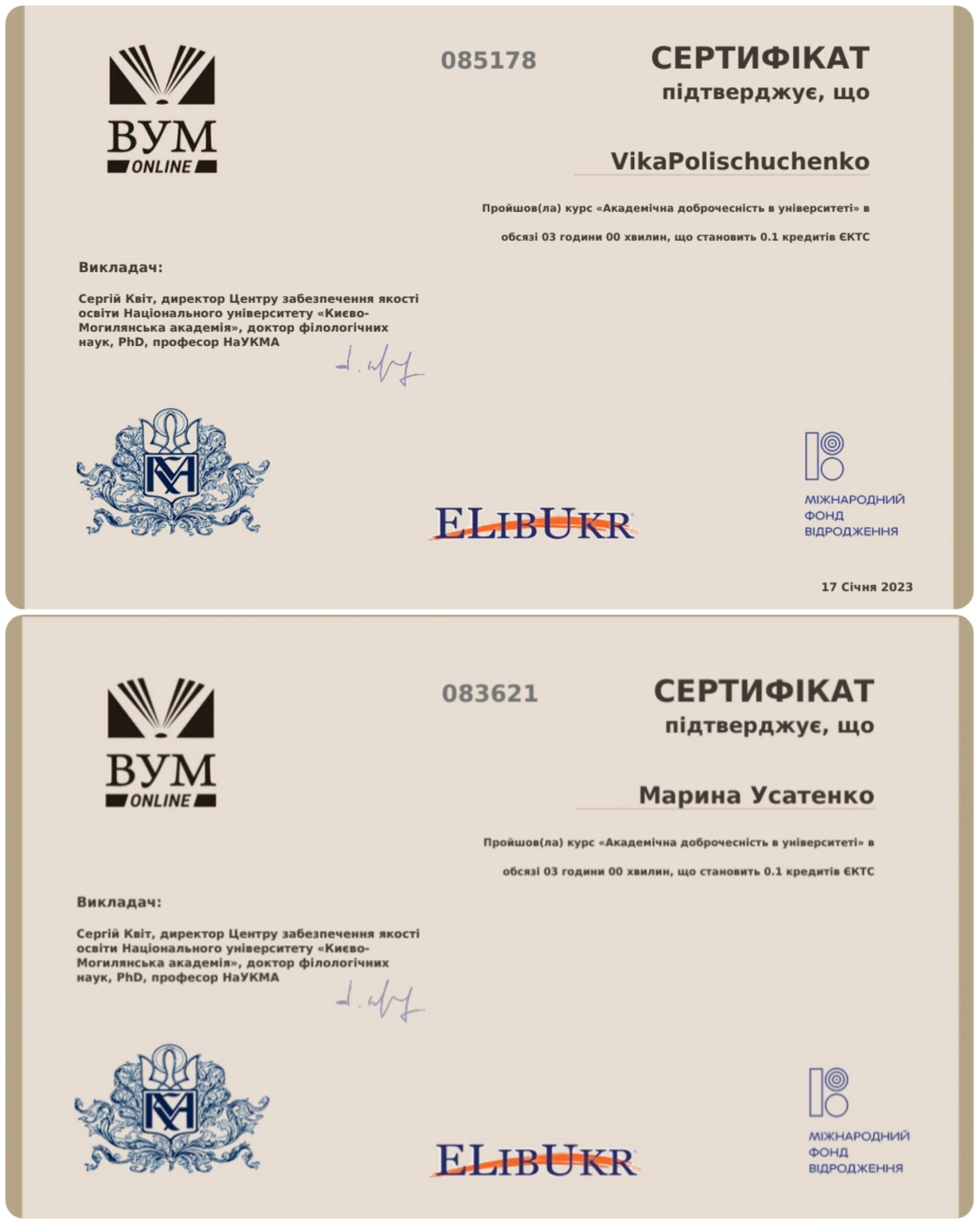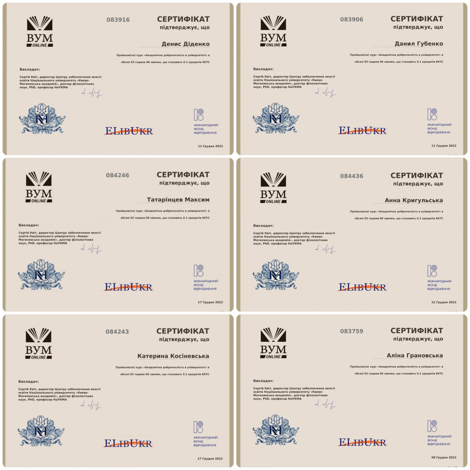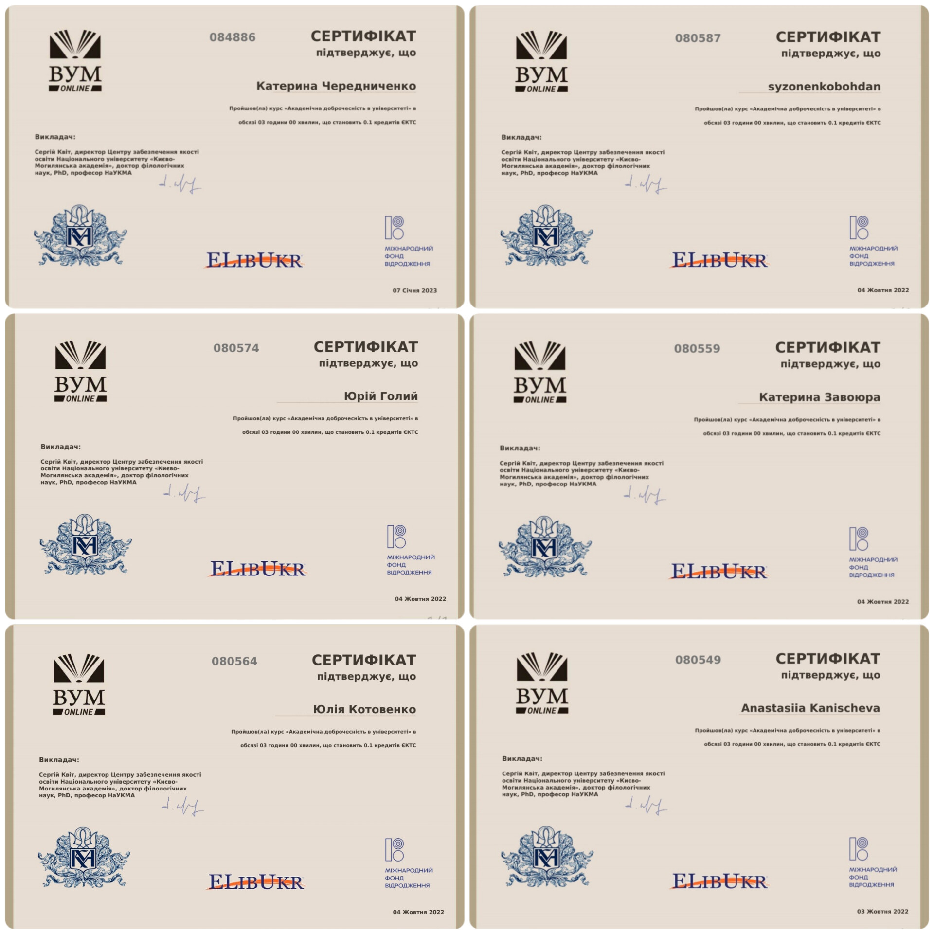 Одним з інструментів впровадження принципів академічної доброчесності в освітню і наукову діяльність університету, який несе просвітницьку функцію, є масові відкриті онлайн-курси за тематикою академічної доброчесності та основ інформаційної грамотності. Магістрам другого курсу навчання спеціальності 051 Економіка був рекомендований курс «Академічна доброчесність в університеті» на платформі https://vumonline.ua/course/academic-integrity-at-the-university/. Здобувачі вищої освіти активно цікавляться й долучаються до популяризації принципів академічної свободи і доброчесності.