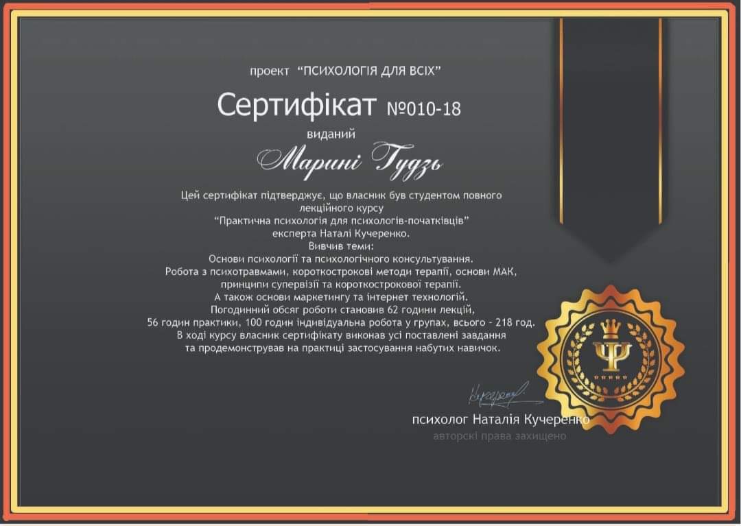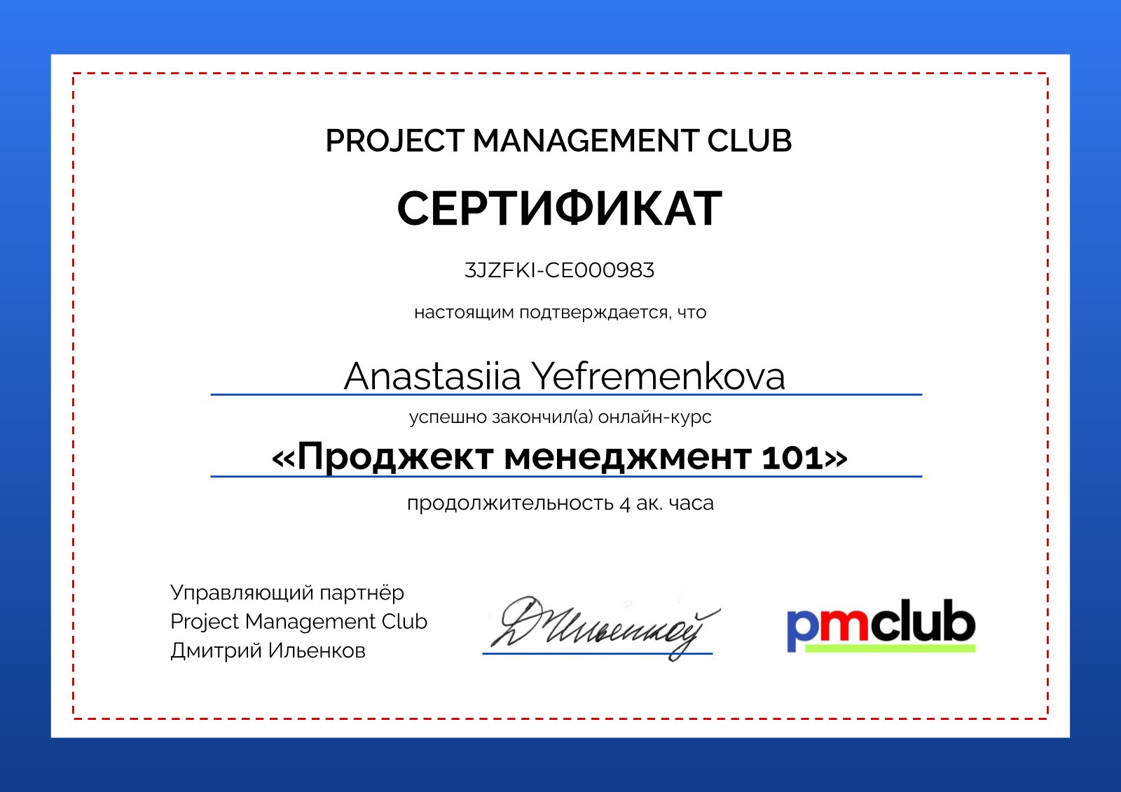 пройшла курс для опанування спеціальності Project Management для використання навичок в подальшій роботі керівника проектами
