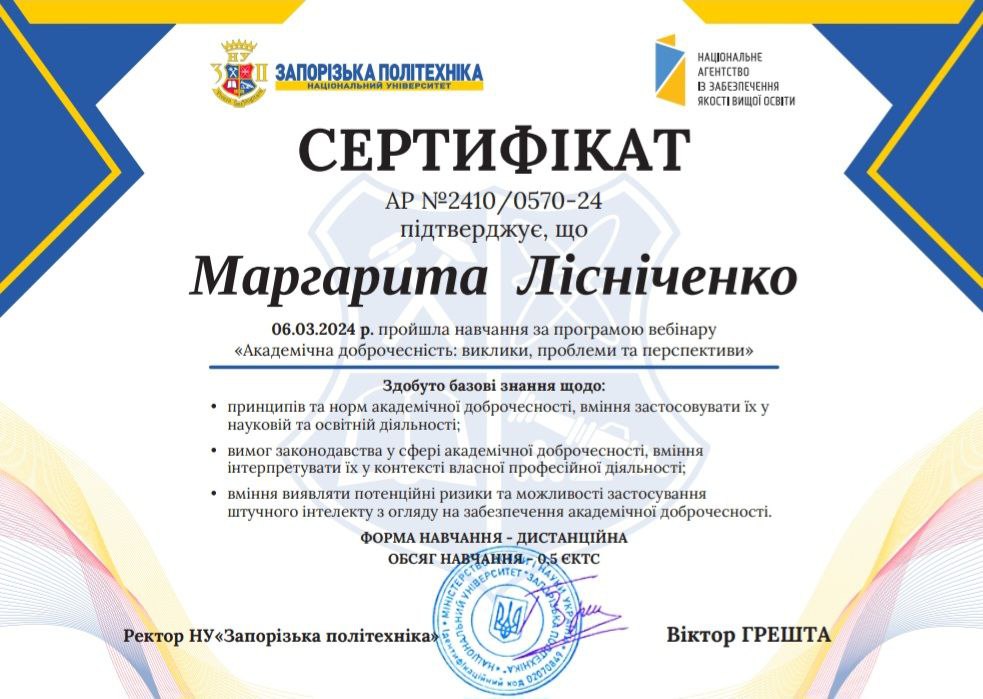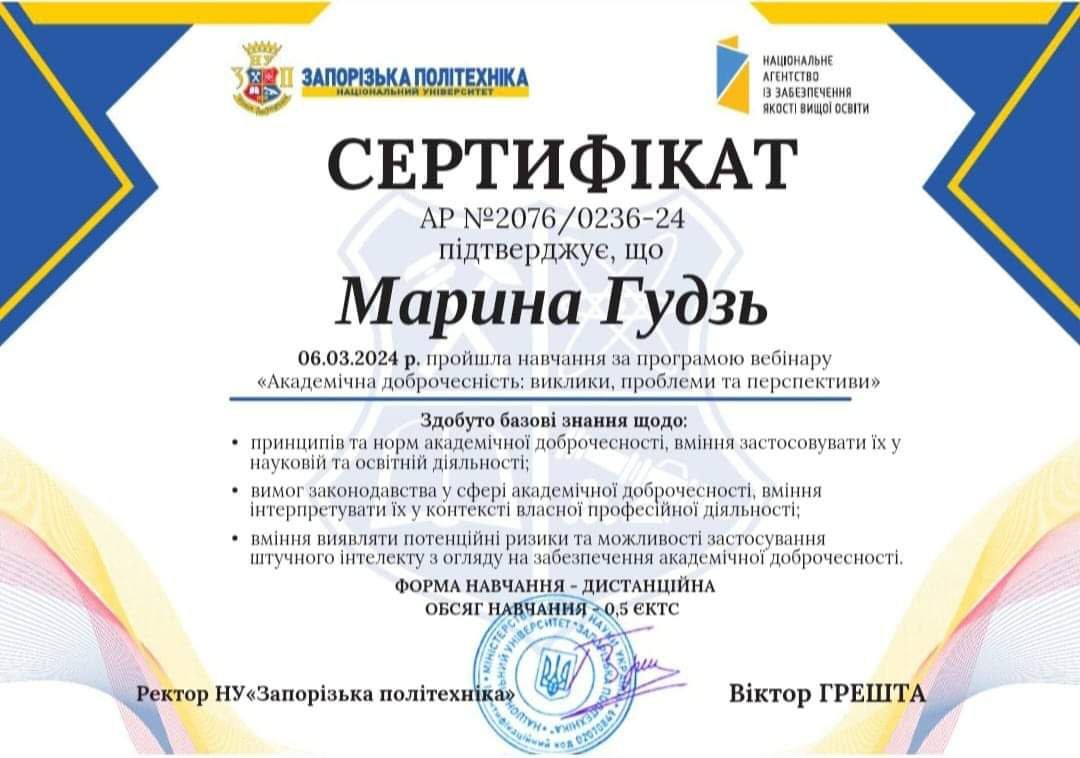 пройшла навчання та підвищення кваліфікації в лютому - червені 2024 р.