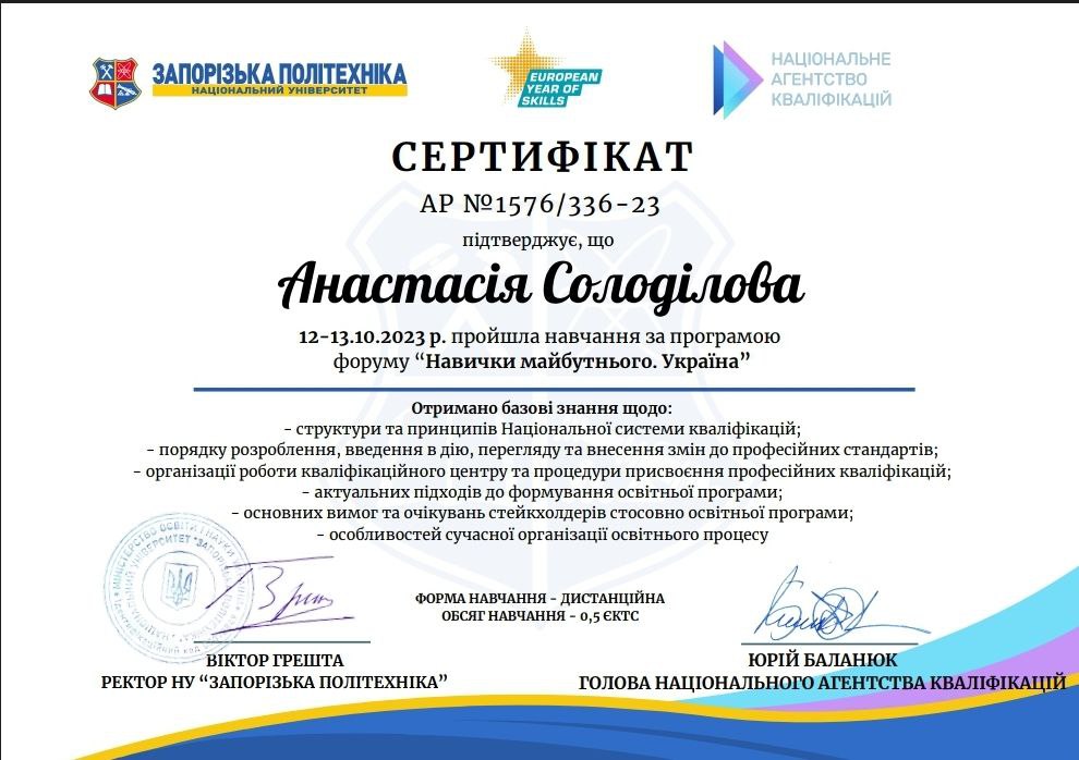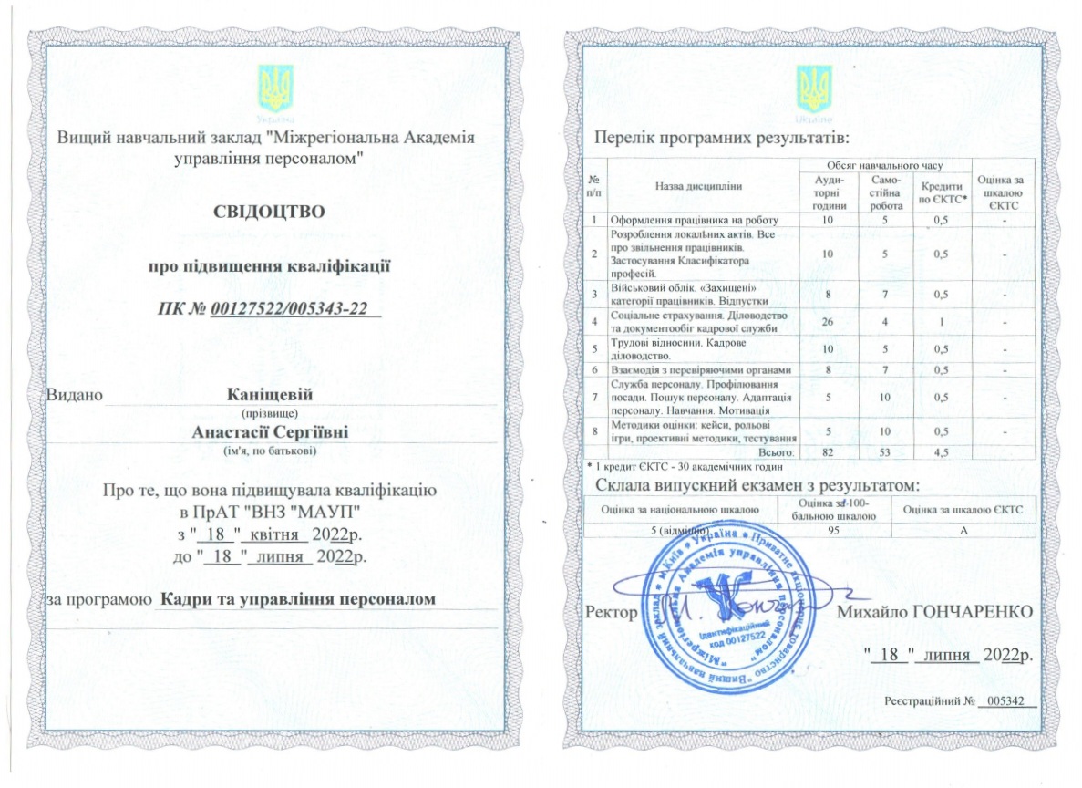 отримала свідоцтво про підвищення кваліфікації за програмою "Кадри та управління персоналом"