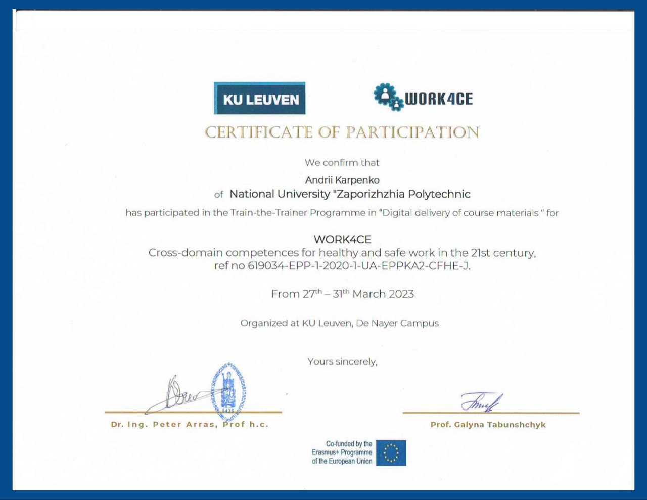 з отриманням сертифіката про учать у програмі «Digital delivery of course materials» for WOR4CE «Міждоменні компетенції для забезпечення здорової та безпечної роботи у 21-му столітті», яка проходила з 27 по 31 березня 2023 року у Католицькому університеті Льовена (Бельгія)