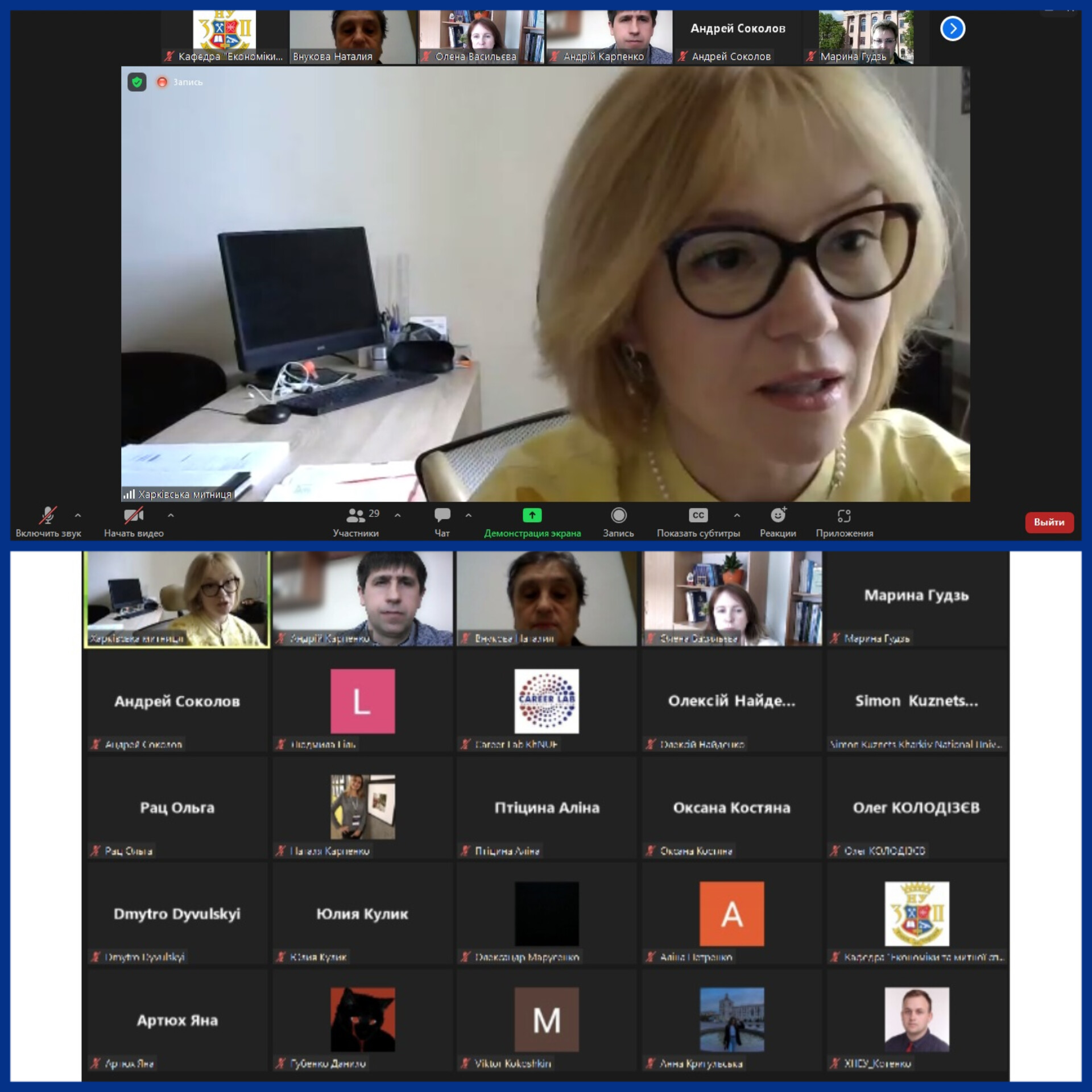Спікерами виступили керівник Департаменту Харківської митниці Катерина Гунько, науково-педагогічні працівники двох ЗВО , д.е.н., проф. Наталія Внукова і д.е.н., проф. Андрій Карпенко та здобувачі вищої освіти партнерських ЗВО Дмитро Дивульський і Яна Артюх.