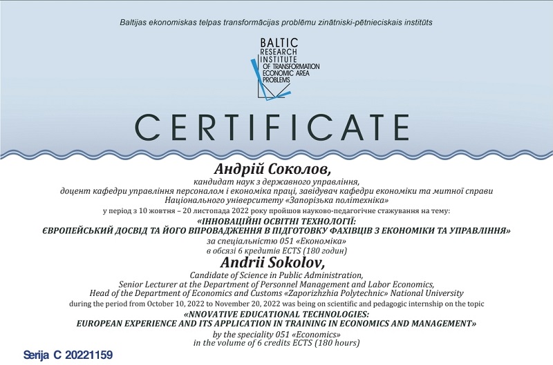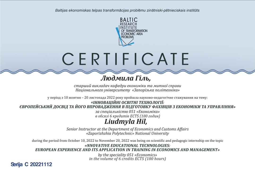 Викладачі кафедри доцент Соколов А.В. та старший викладач Гіль Л.А. успішно завершили науково-педагогічне стажування у Балтійському науково-дослідному інституті проблем трансформації економічного простору (Латвійська Республіка) на тему «Інноваційні освітні технології: Європейський досвід та його впровадження в підготовку фахівців з економіки та управління» за спеціальністю 051 Економіка в обсязі 6 кредитів ECTS (180 годин) та отримали відповідні сертифікати.
