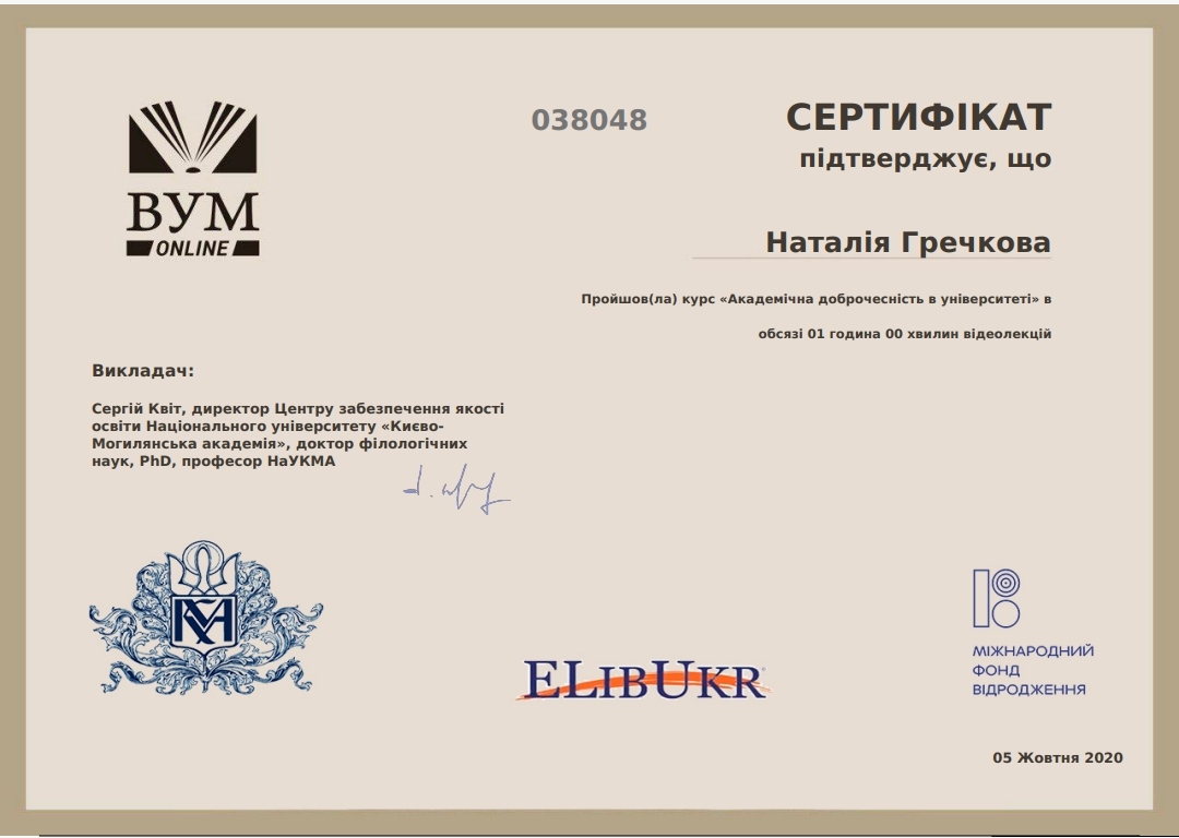 Одним з інструментів впровадження принципів академічної доброчесності в освітню і наукову діяльність університету, який несе просвітницьку функцію, є масові відкриті онлайн-курси за тематикою академічної доброчесності та основ інформаційної грамотності. Студентам спеціальності 051 Економіка був рекомендований курс «Академічна доброчесність в університеті» на платформі https://vumonline.ua/course/academic-integrity-at-the-university/. Здобувачі вищої освіти активно цікавляться й долучаються до популяризації принципів академічної свободи і доброчесності.