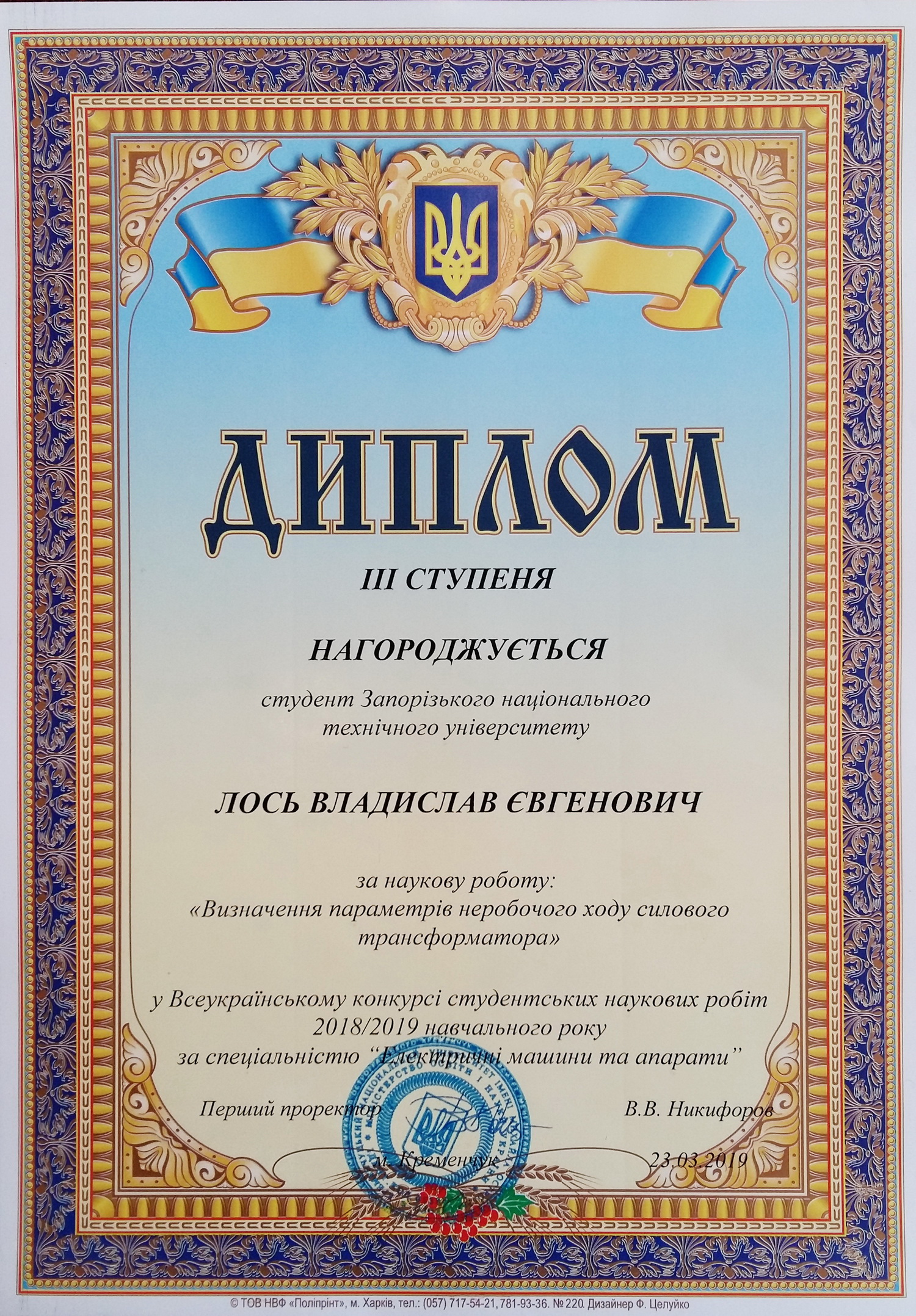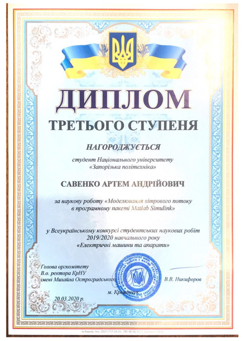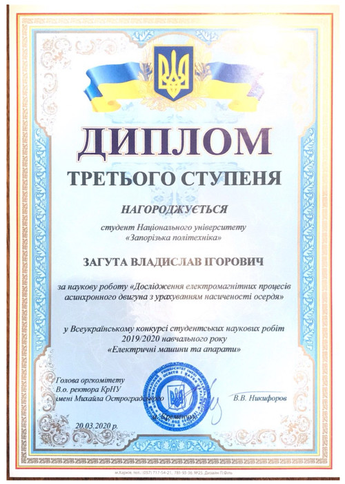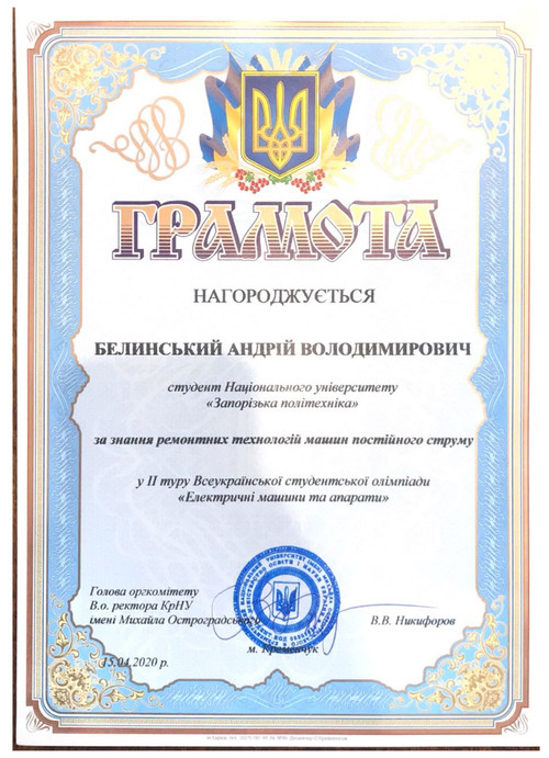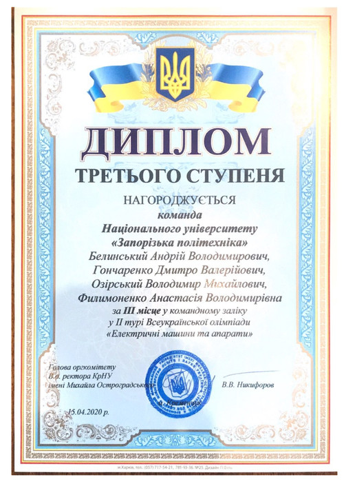 за ІІІ місце у командному заліку у ІІ турі Всеукраїнської студентської олімпіади “Електричні машини і апарати” 2020 рік.