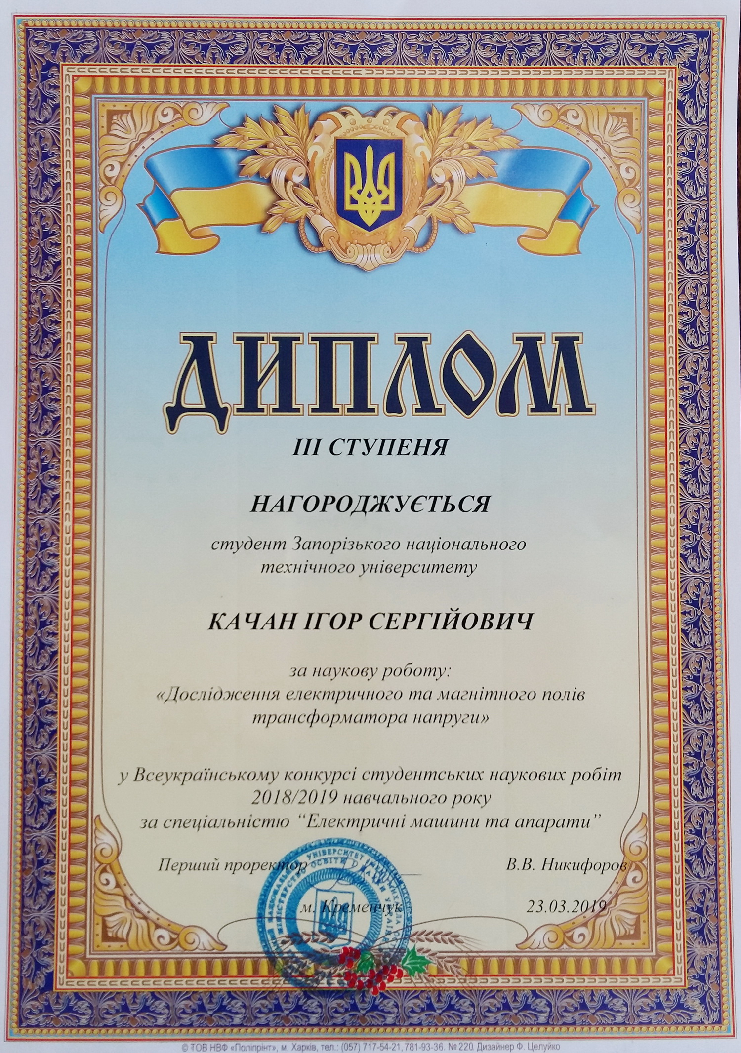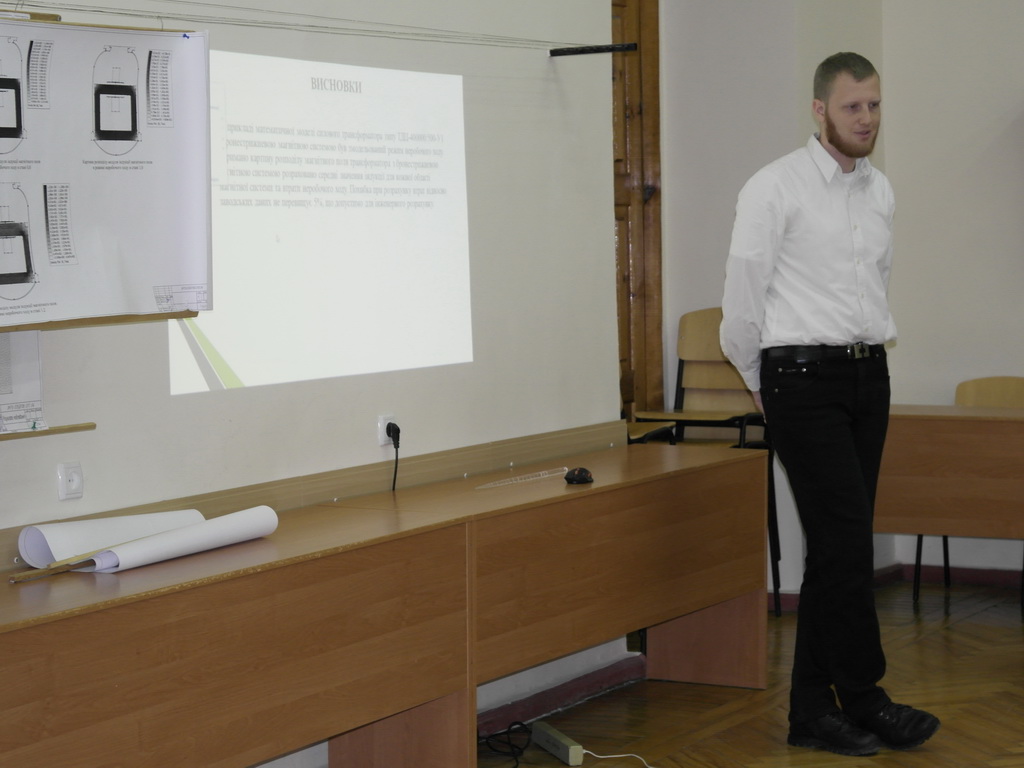 1. Гордієнка Дмитра Вікторовича на тему: «Порівняльний аналіз методик визначення напруг короткого замикання силового трансформатора ТДТН-80000/110»,  керівник доцент Яримбаш С.Т.