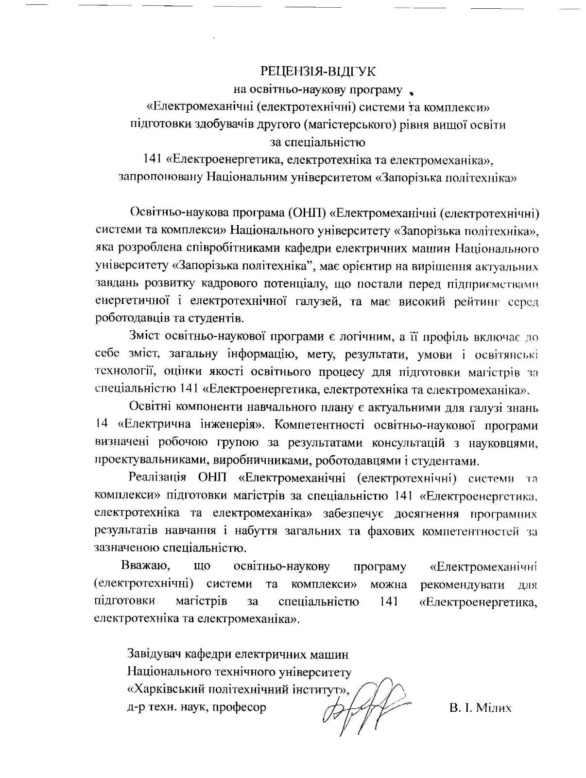 Проєкт ОНП підготовки здобувачів другого (магістерського) рівня вищої освіти «Електромеханічні (електротехнічні) системи та комплекси» за спеціальністю 141 «Електроенергетика, електротехніка та електромеханіка» (PDF, 884 KБ)