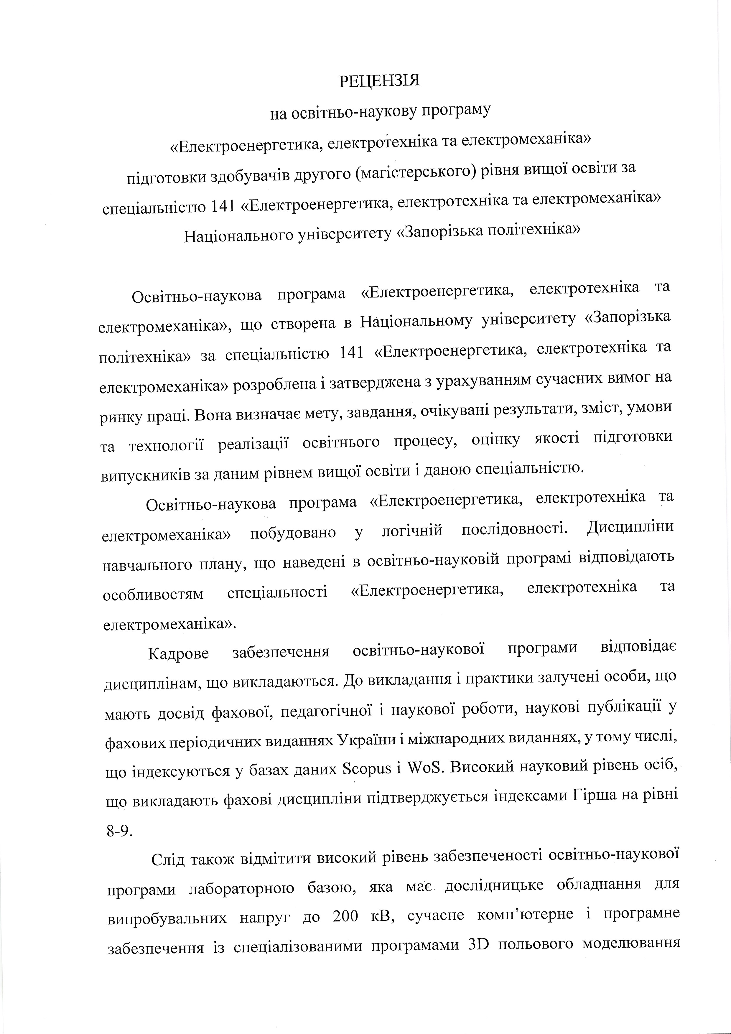 Профіль освітньо-наукової програми Електромеханічні (електротехнічні) системи та комплекси за спеціальністю 141 "Електроенергетика, електротехніка та електромеханіка"