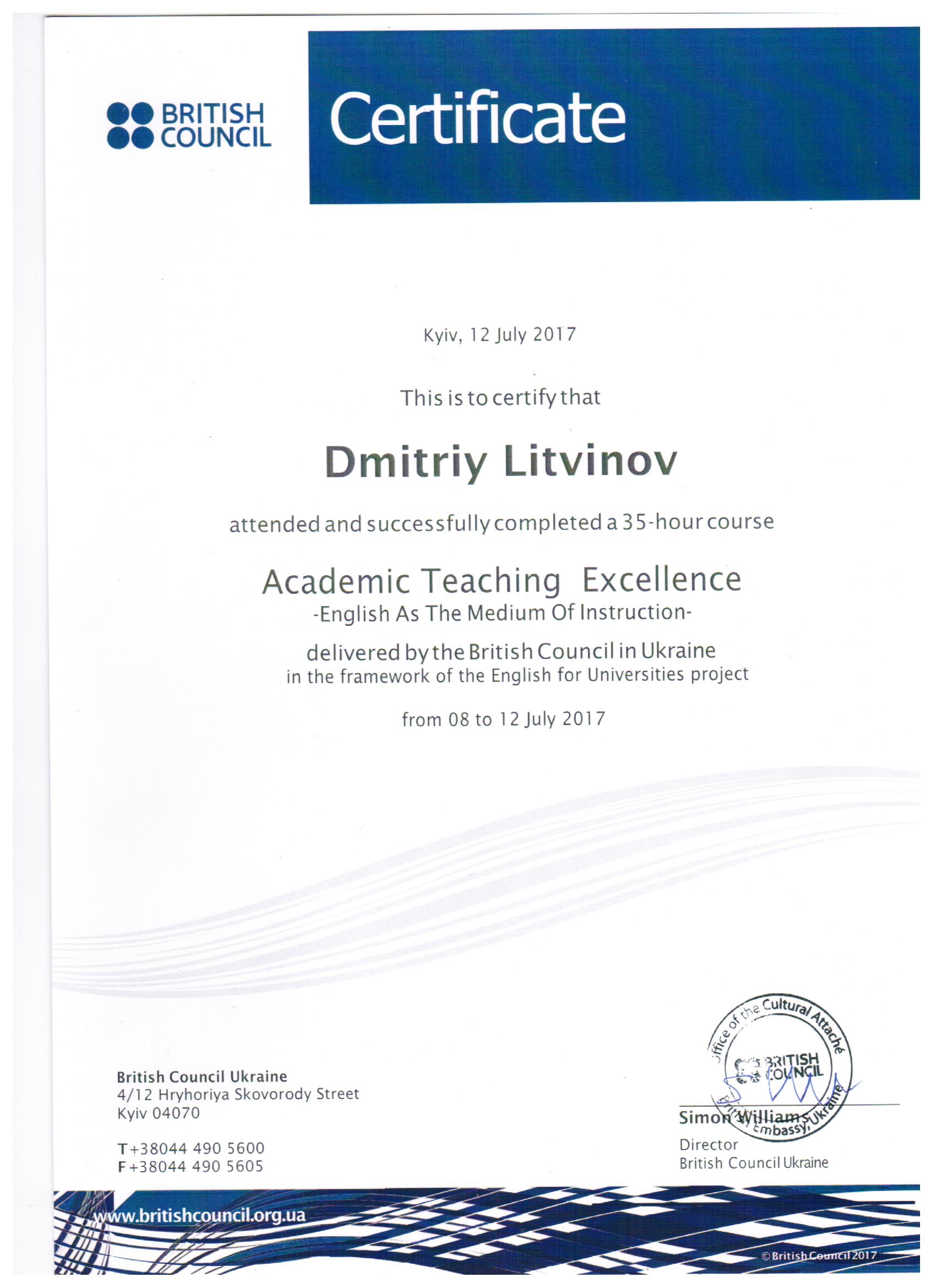 У рамках проекту «Англійська мова для університетів» 08-12 липня 2017 року старший викладач кафедри Літвінов Дмитро Олександрович приймав участь у проекті «British Council English for Universities» по розвитку та методикам викладання у вищих навчальних закладах другою (англійською) мовою. За результатами успішного проходження 35-годинних курсів Літвінов Д. О. отримав сертифікат від Британської Ради по вдосконаленню академічного викладання.