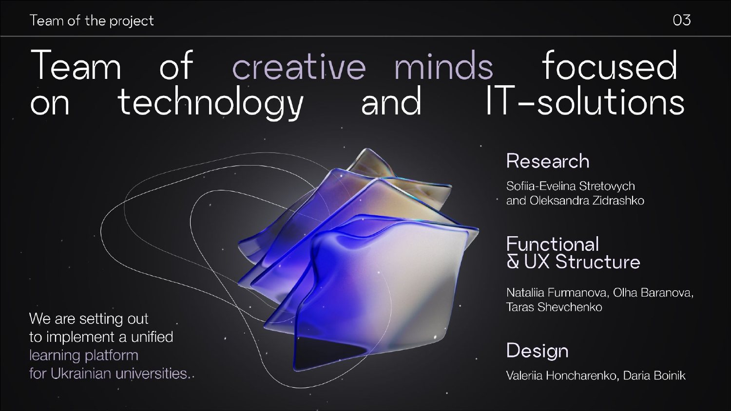 Під керівництвом викладача кафедри ІТЕЗ, керівника Інжинірингової школи "Ноосфера"  Шевченка Олексія Станіславовича було реалізовано проєкт "Симфонія стихій" для 3D-моделюванням та створенням fulldom-відео займались здобувачі освіти Олександр Щукін  (аспірант), Олексій Романченко (БК-612сп), Іван Глущенко (БК-612сп), Денис Щукін (БК-613м) та Артур Мимріков (БК-613сп). Проєкт був створений на замовлення сучасного науково-просвітницького центру астрономії, науки та техніки, платформи популяризації STEM-освіти та трансформації знань Planetarium Noosphere.