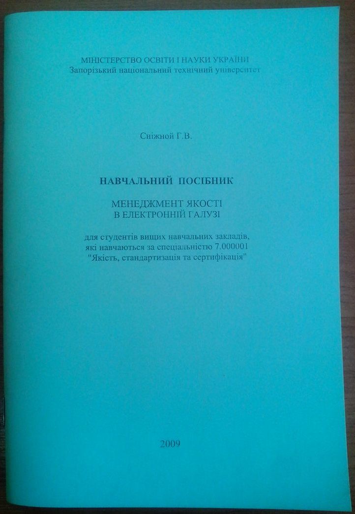Сніжной Г.В., Степаненко С.М.  „Менеджмент і нормативне забезпечення якості у електронній галузі”  / Навчальний  посібник (з грифом МОНУ). -  Запоріжжя: ЗНТУ, 2010. - 126 с.