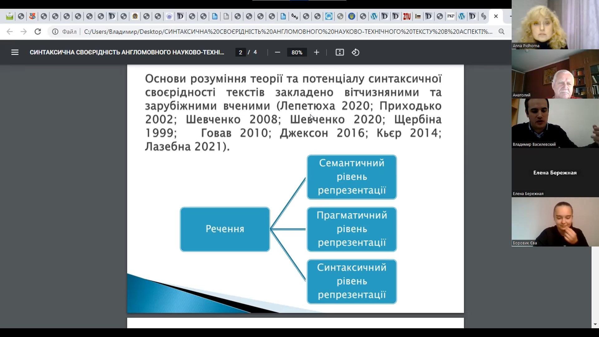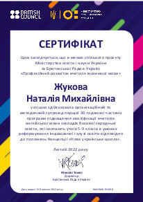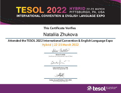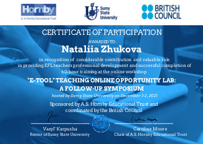 Викладачі кафедри знаходяться у постійному розвитку, набуваючи інноваційних навичок та вмінь на різноманітних тренінгах (Жукова Н.М.: Online Teacher Community Facilitator Training course, вересень-грудень 2021) та курсах (Жукова Н.М.: CELTA (Cambridge English Level 5 Certificate in Teaching English to Speakers of Other Languages), вересень-листопад 2021), ділячись досвідом на воркшопах (Жукова Н.М.:“Feedback-Driven Culture in Our Classroom and beyond” в межах симпозіуму “E-TOOL” (Teaching Online Opportunity Lab: A Follow-up Symposium), грудень 2021; «Content-Based Instruction» в межах проєкту «Until Every Barrier Falls», січень 2022 ) та у процесі підвищення кваліфікації (Бикова Ю.О.: ). Наші фахівці не залишають поза увагою й науковий простір. Вони приймають активну участь у міжнародних конференціях й семінарах (Войтенко С.В., Сивачук О.М.: “Сучасні проблеми викладання іноземних мов у закладах освіти”, січень 2021), виголошують результати наукових досліджень у фахових виданнях (Фесенко І. М., Сивачук О. М. Англомовна комп’ютерна термінологія: структурні особливості та способи творення. Нова філологія. Збірник наукових праць. Запоріжжя: Видавничий дім «Гельветика», 2021. ‒ No 84. ‒ С. 248-254) і журналах, що входять до наукометричної міжнародної бази даних Web of Science Core Collection WoS(CC) (Adamenko , O., & Klymenko, O. (2020). Communicative Behavior via Gender Identity (Based on the English language “Love Stories”). PSYCHOLINGUISTICS, 27(2), 44-70.).