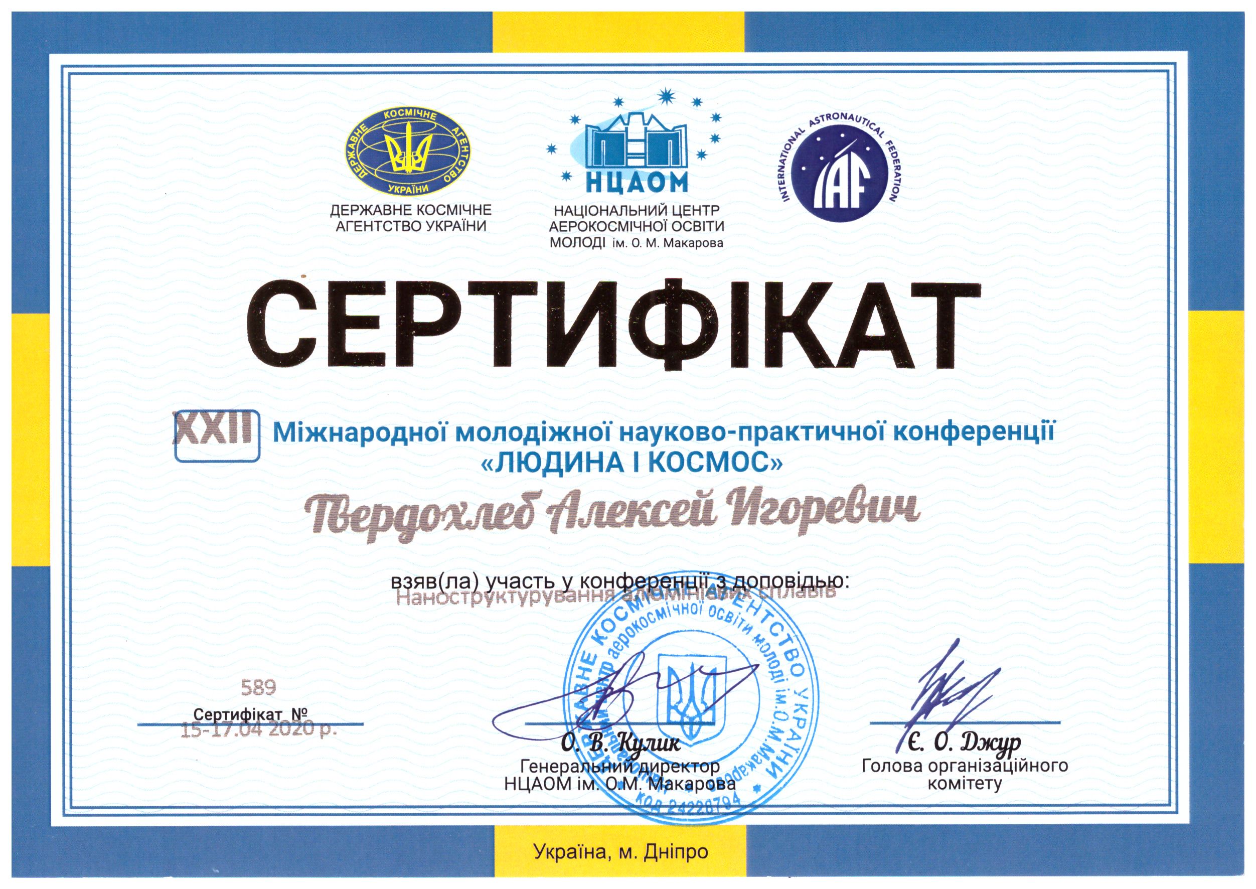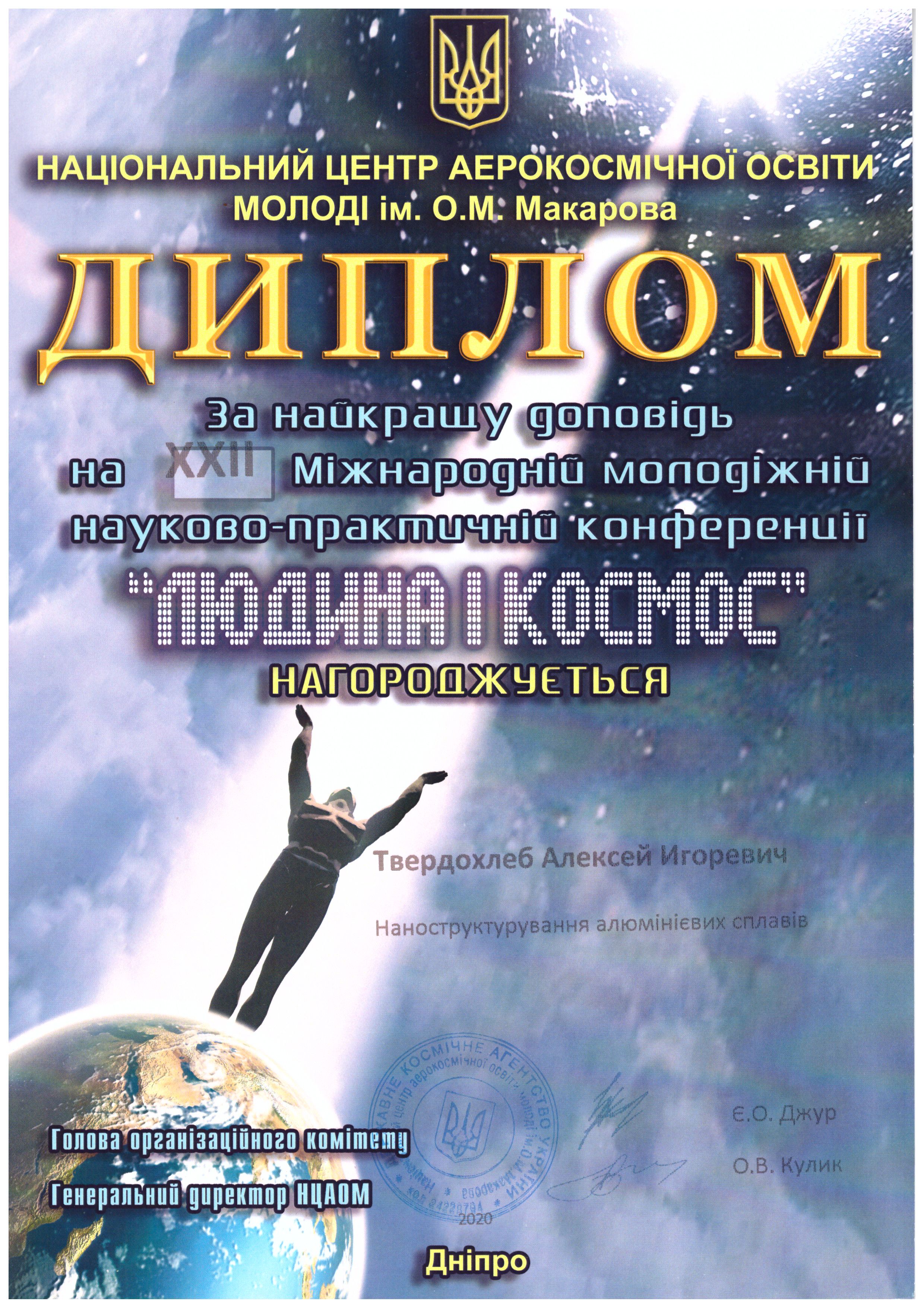 Твердохліб Олексій Ігоровоч, студент гр. БАД-219м у 2020 році за найкращу доповідь на ХХІІ міжнародній науково-практичній конференції «Людина і космос» (м.Дніпро) він був нагороджений дипломом.