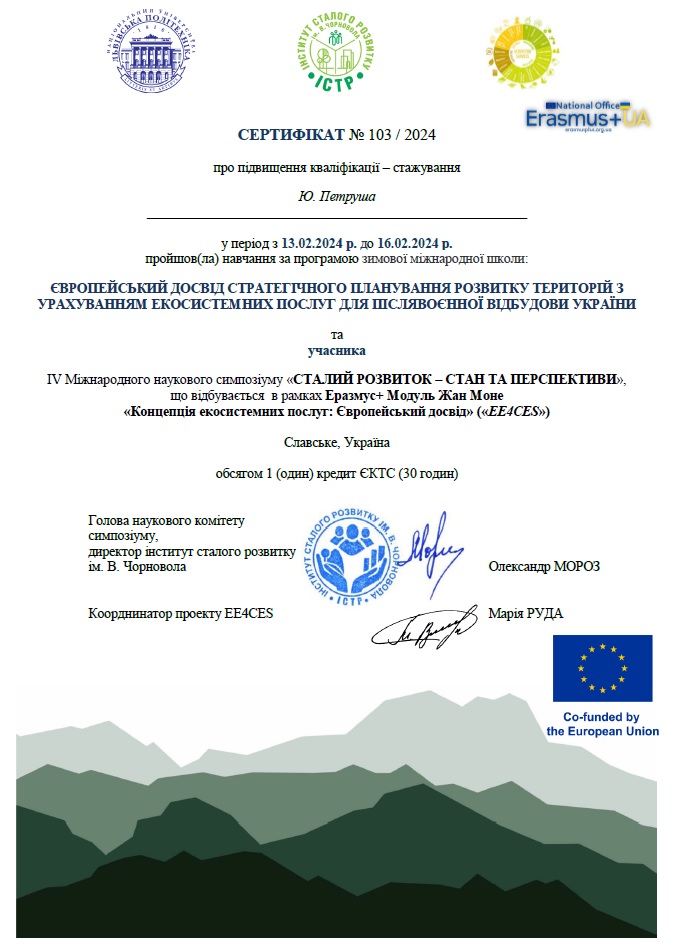 1. Зимова міжнародна школа «Європейський досвід стратегічного планування розвитку територій з урахуванням екосистемних послуг для післявоєнної відбудови України» (13-16 лютого 2024 р., м. Славське, Україна) в рамках Еразмус+ Модуль Жан Моне «Концепція екосистемних послуг: Європейський досвід» («ЕЕ4CES») (сертифікат № 103/2024, 1 кредит, 30 годин).