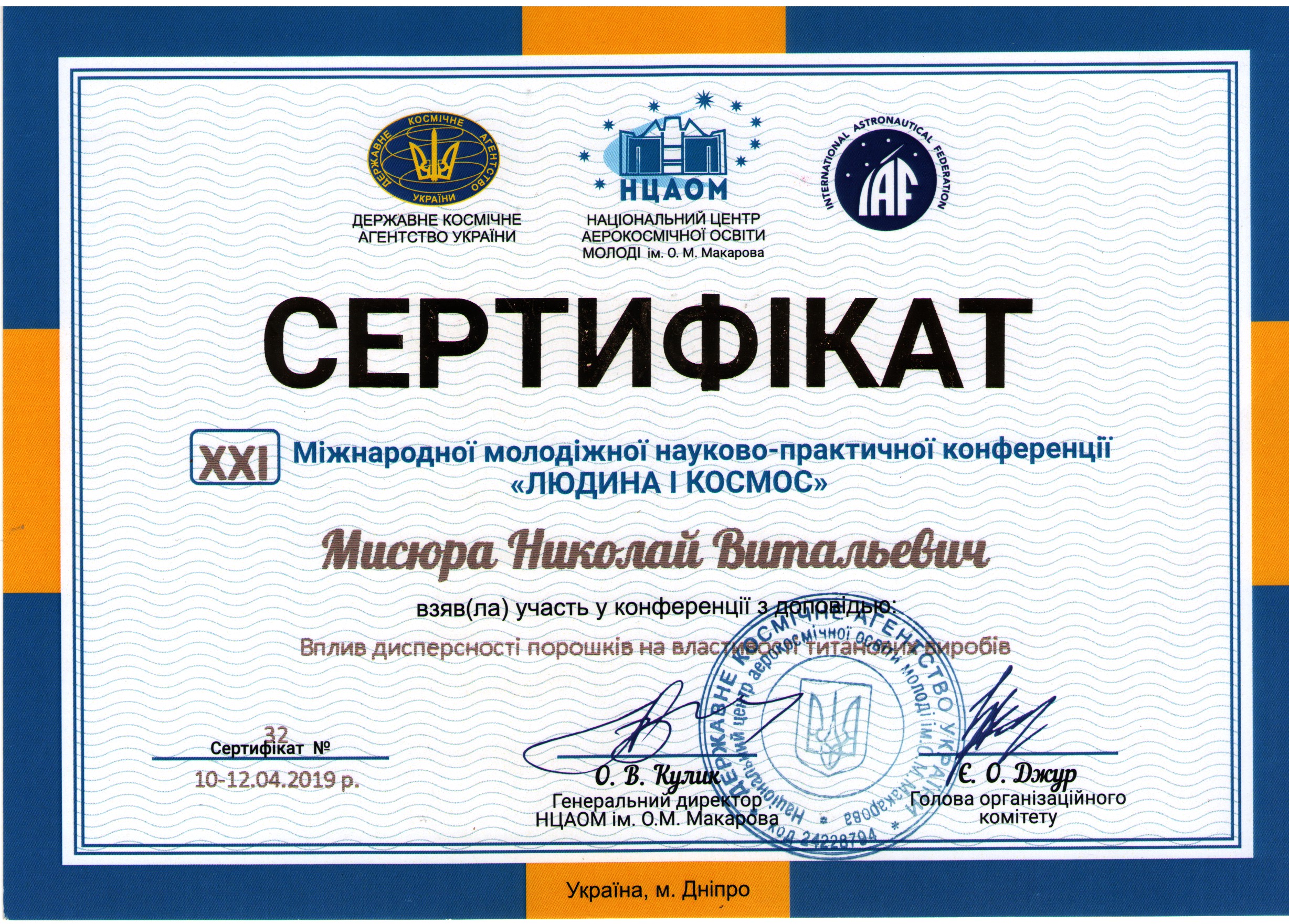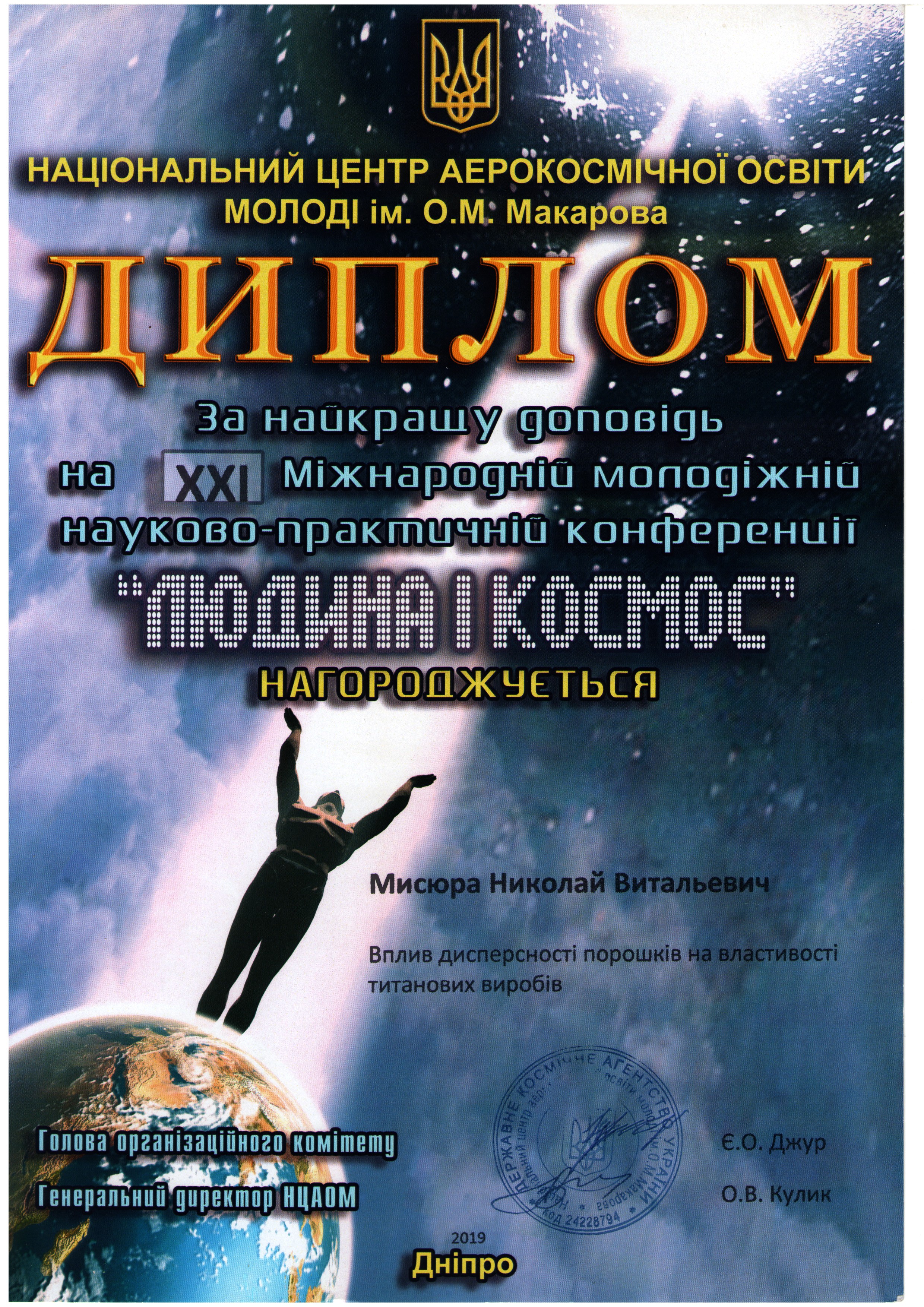 Місюра Микола Віталійович, студент гр. БАД-215 приймав активну участь у науковій діяльності кафедри. У 2019 році за найкращу доповідь на ХХІ Міжнародній науково-практичній конференції «Людина і космос» (м.Дніпро) він був нагороджений дипломом.