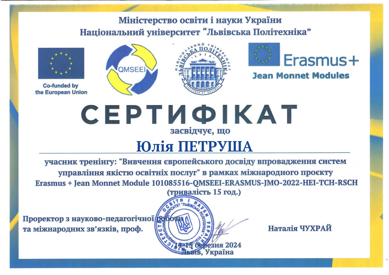 2. Тренінг «Вивчення європейського досвіду впровадження систем управління якістю освітніх послуг» в рамках міжнародного проєкту Erasmus+ Jean Monnet Module 101085516-QMSEEI-ERASMUS-JMO-2022-HEI-TCH-RSCH «Європейський досвід впровадження систем управління якістю продукції та послуг» (14-15 березня 2024 року, сертифікат на 15 годин).