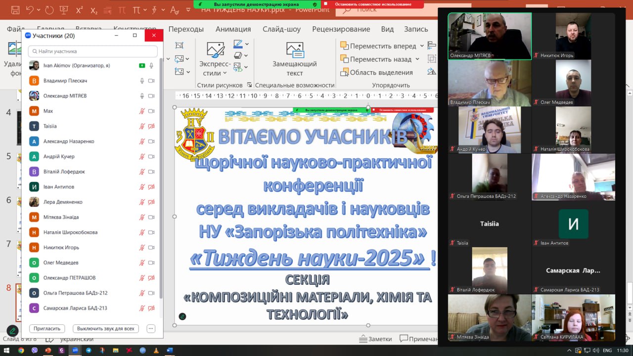 18 квітня 2025 року в рамках проведення науково-практичної конференції «Тиждень науки – 2025» відбулося засідання секції «Композиційні матеріали, хімія та технології». В засіданні прийняли участь викладачі та співробітники кафедри, студенти та аспіранти. Під час роботи було заслухано 24 доповіді та повідомлення за актуальними науково-практичними темами. Робота секції відзначилася високою зацікавленістю всіх її учасників та побажаннями проводити подібні зустрічі на такому ж високому рівні.