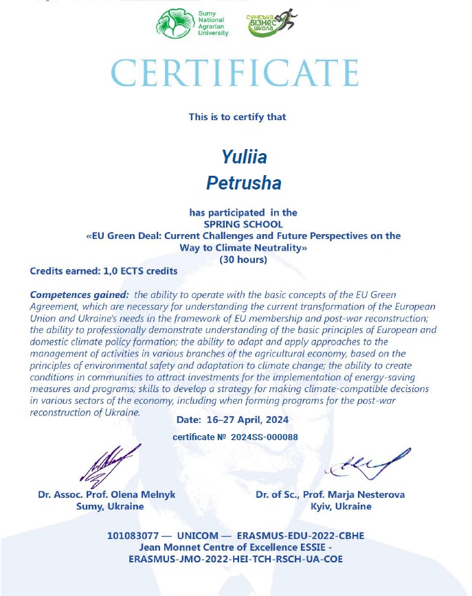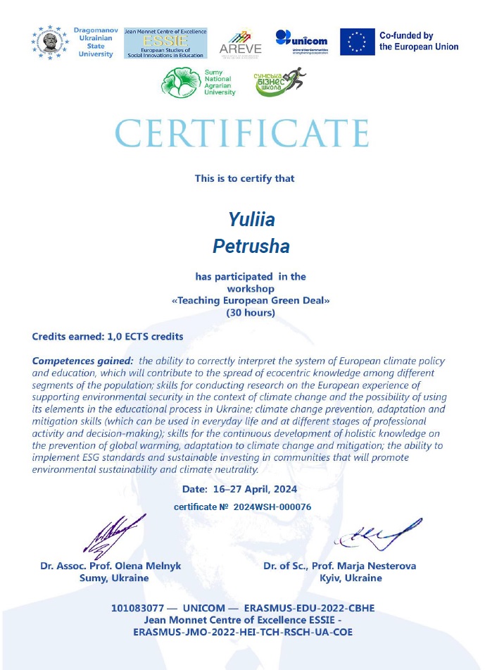 3. Весняна школа «Зелена угода ЄС: поточні виклики та майбутні перспективи на шляху до кліматичної нейтральності» в рамках міжнародного проєкту Erasmus+ Jean Monnet Module 101083077 UNICOM-ERASMUS-EDU-2022-CBHE (16-27 квітня 2024 р., Україна). Сертифікат № 2024SS-000088, 1 кредит, 30 годин.