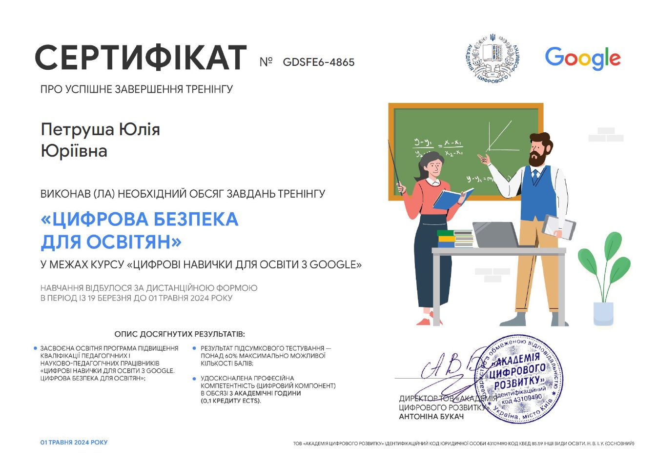 5. Тренінг «Цифрова безпека для освітян» у межах курсу «Цифрові навички для освіти з Google» (19 березня – 1 травня 2024 р., Україна). Сертифікат № GDSFE6-4865 від 01.05.24 р., 0,1 кредит, 3 години.