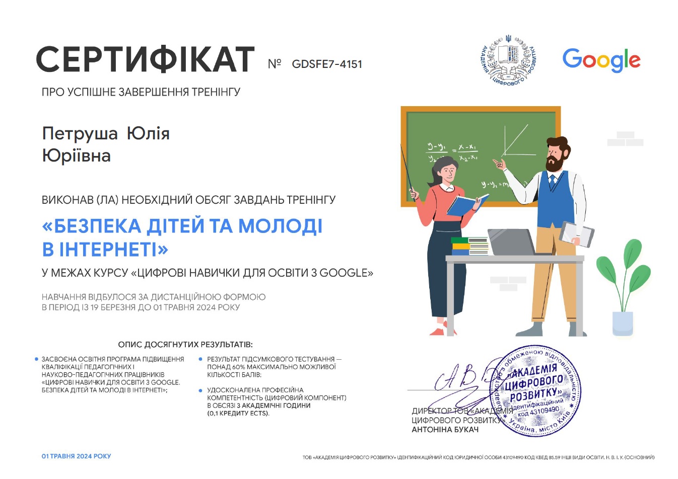 6. Тренінг «Безпека дітей та молоді в інтернеті» у межах курсу «Цифрові навички для освіти з Google» (19 березня – 1 травня 2024 р., Україна). Сертифікат № GDSFE7-4151 від 01.05.24 р., 0,1 кредит, 3 години.