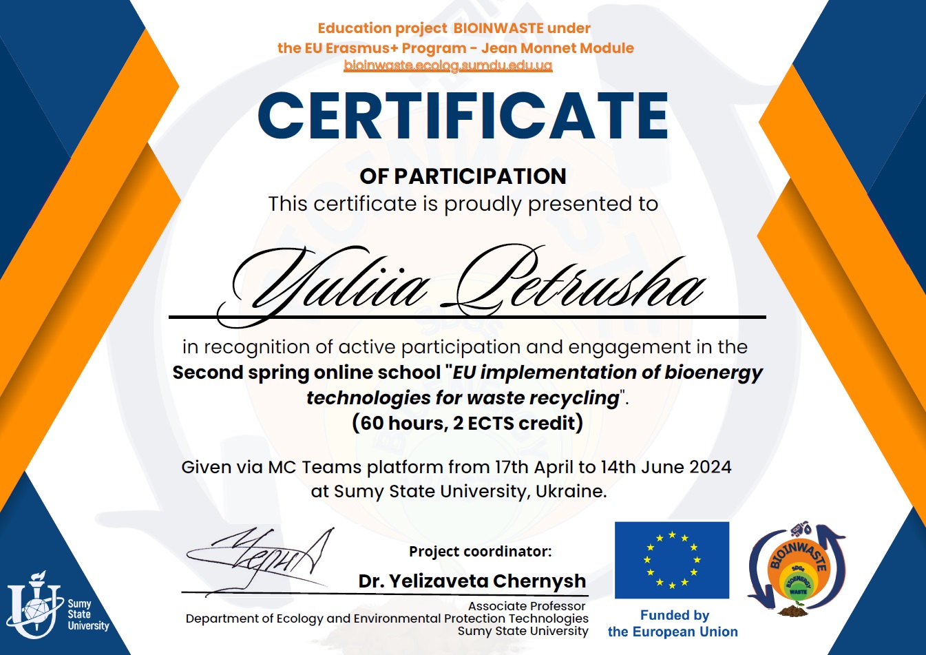 7. ІІ весняна школа «Впровадження в ЄС біоенергетичних технологій для переробки відходів» в межах модулю ім. Жан Моне «BIOINWASTE» програми ЄС Еразмус+ (17 квітня – 14 червня 2024 р.). Сумський національний університет, сертифікат 2 кредити (60 годин).