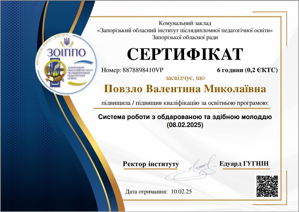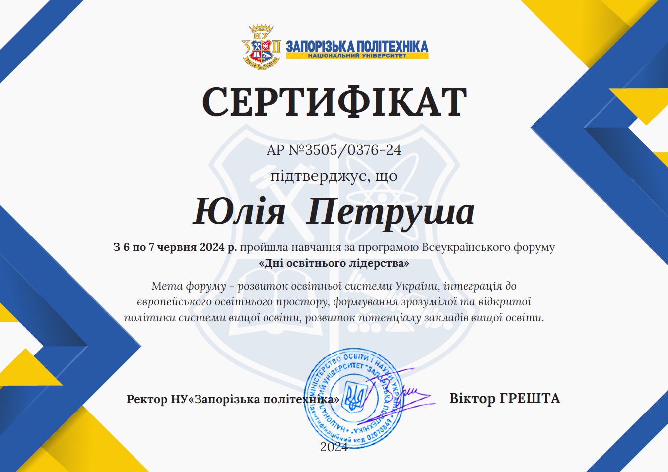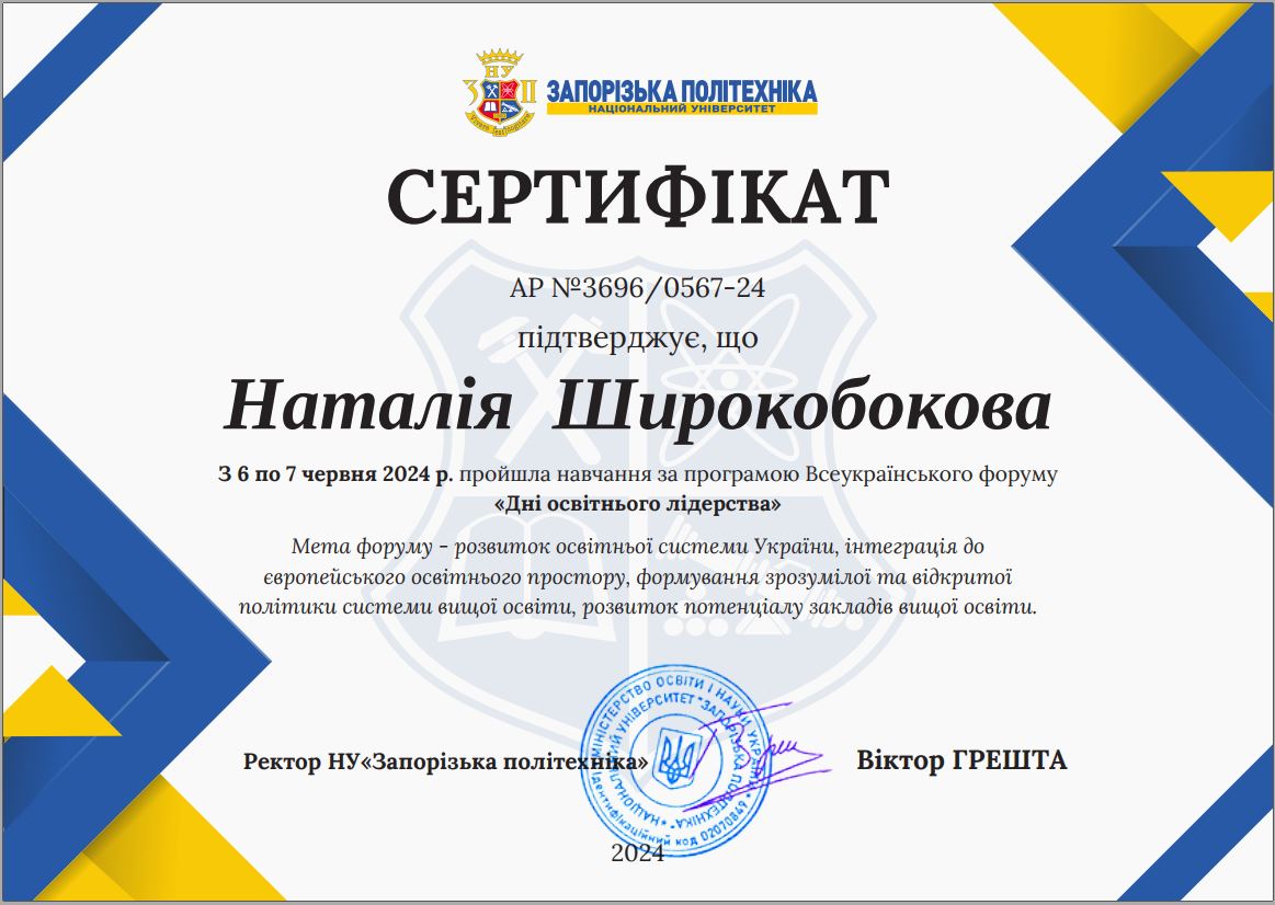 8. Всеукраїнський форум «Дні освітнього лідерства 2024» (6-7 червня 2024 р.). НУ «Запорізька політехніка», сертифікат АР №3505/0376-24 (0,5 кредиту).