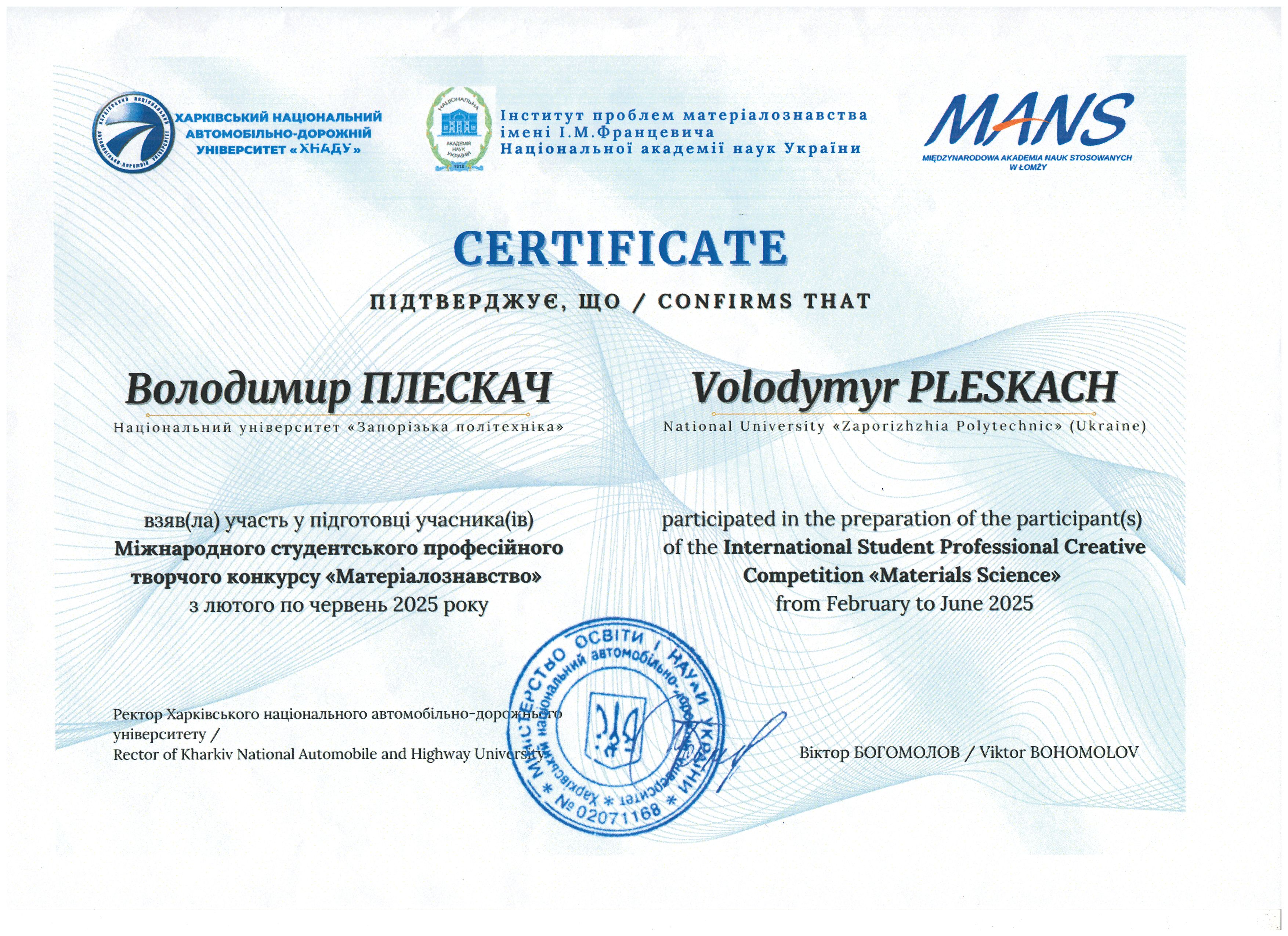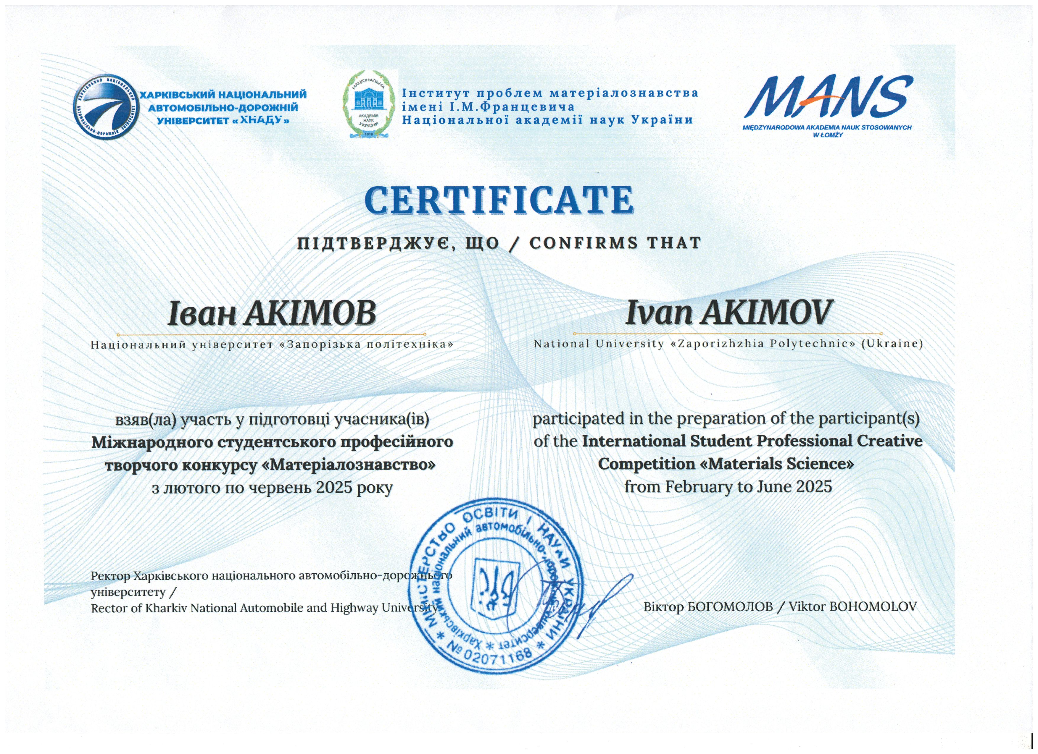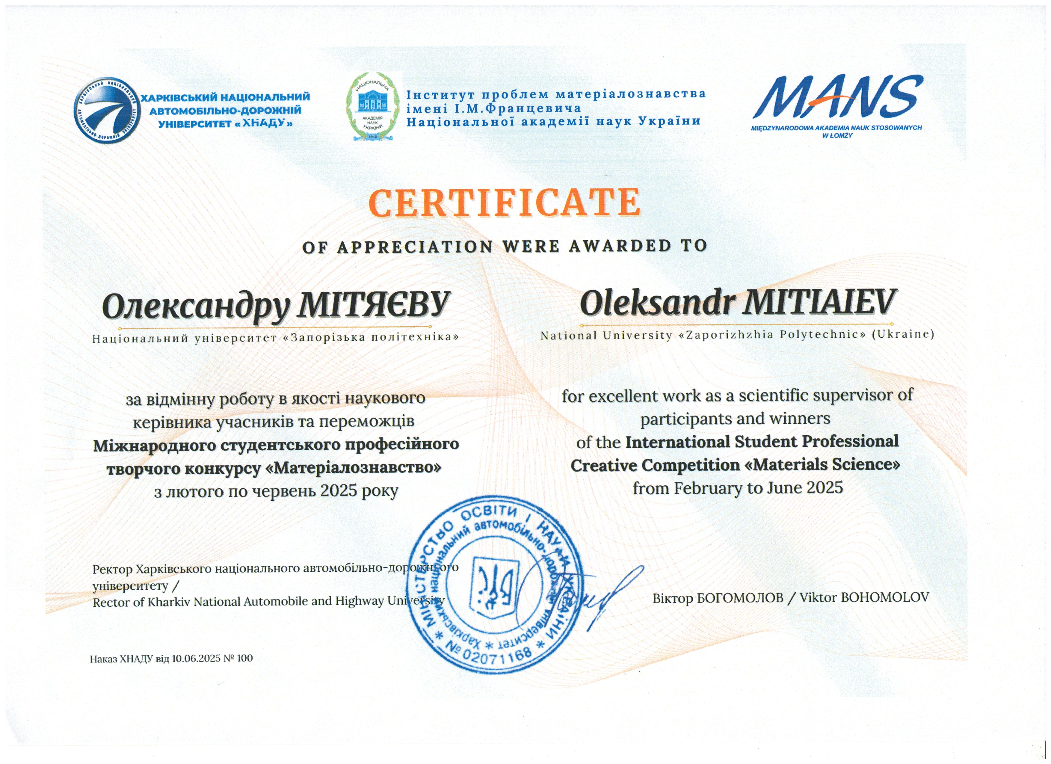Завідувач кафедри професор Олександр МІТЯЄВ отримав сертифікат за відмінну роботу в якості наукового керівника учасників та переможців Міжнародного студентського професійного творчого конкурсу "Матеріалознавство"