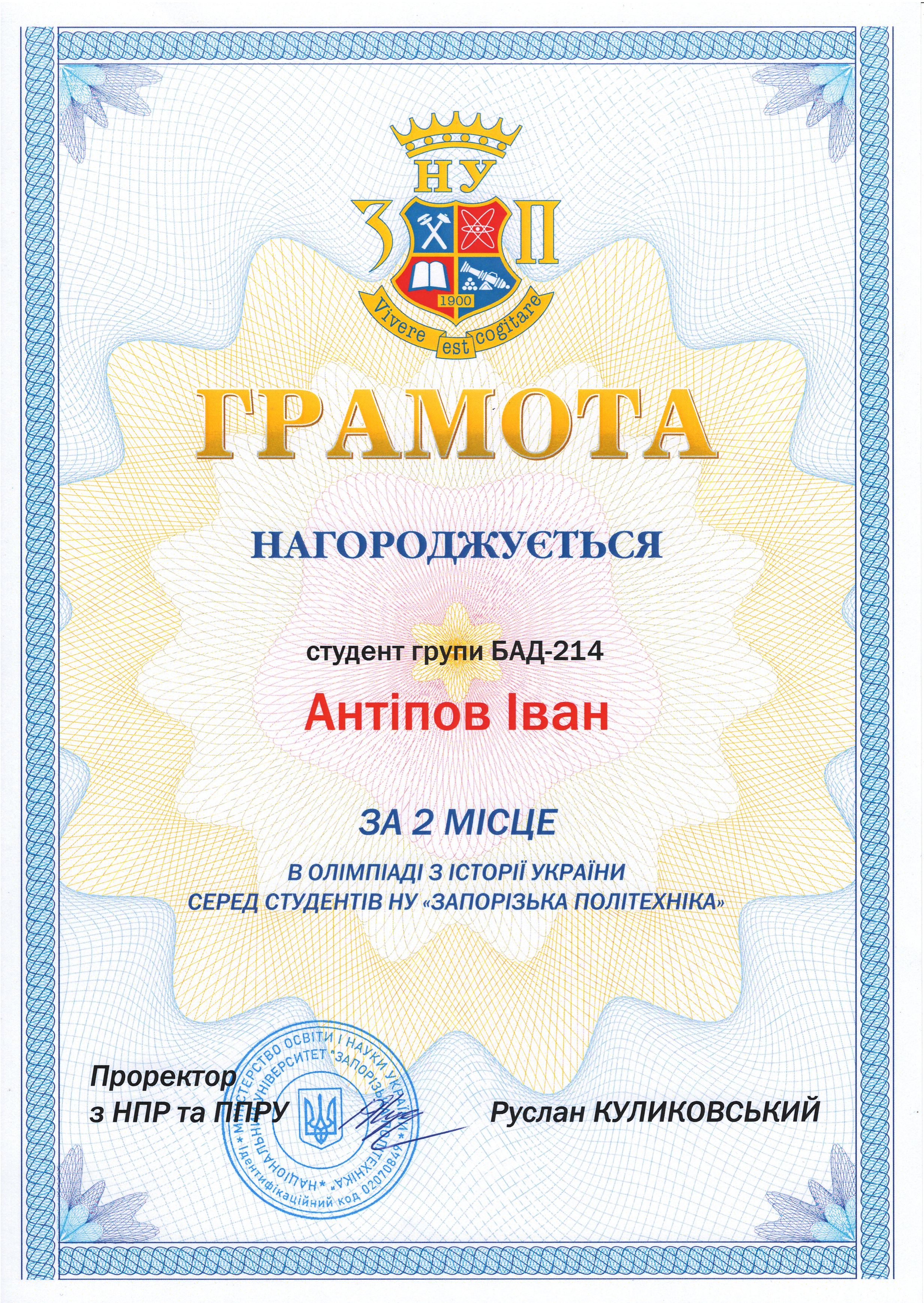 Антипов Іван студент групи БАД-214 був нагороджений Грамотою за ІІ місце в Олімпіаді з історії України серед студентів НУ "Запорізька політехніка".