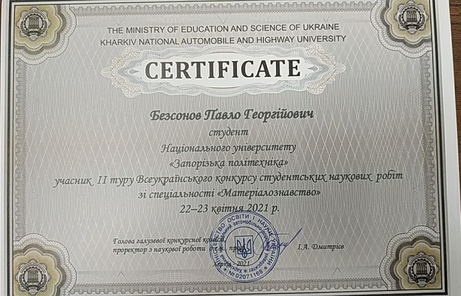 Безсонов Павло Георгійович студент групи БАД-218 прийняв участь у ІІ турі Всеукраїнського конкурсу студентських наукових робіт зі спеціальності «Матеріалознавство» 22-24 квітня 2021 р.
