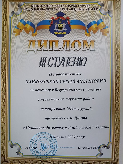 За перемогу у Всеукраїнському конкурсі студентських наукових робіт за напрямком «Металургія» Чайковський Сергій Андрійович, студент групи БАД-211м нагороджен Дипломом ІІІ-го ступеню