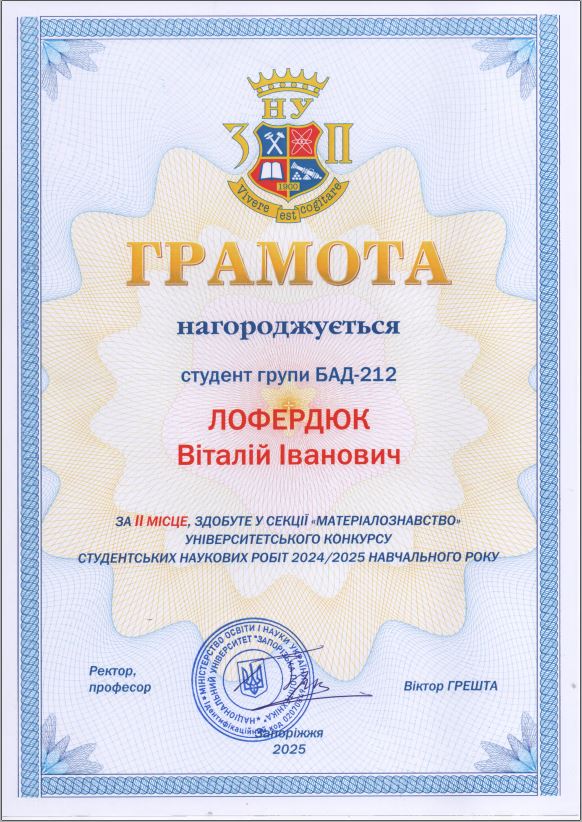 6 лютого 2025 року пройшла урочиста церемонія підбиття підсумків університетського конкурсу студентських наукових робіт. Лофердюк Віталій Іванович, студент гр. БАД-212 був нагороджений грамотою за ІІ місце у секції "Матеріалознавство".