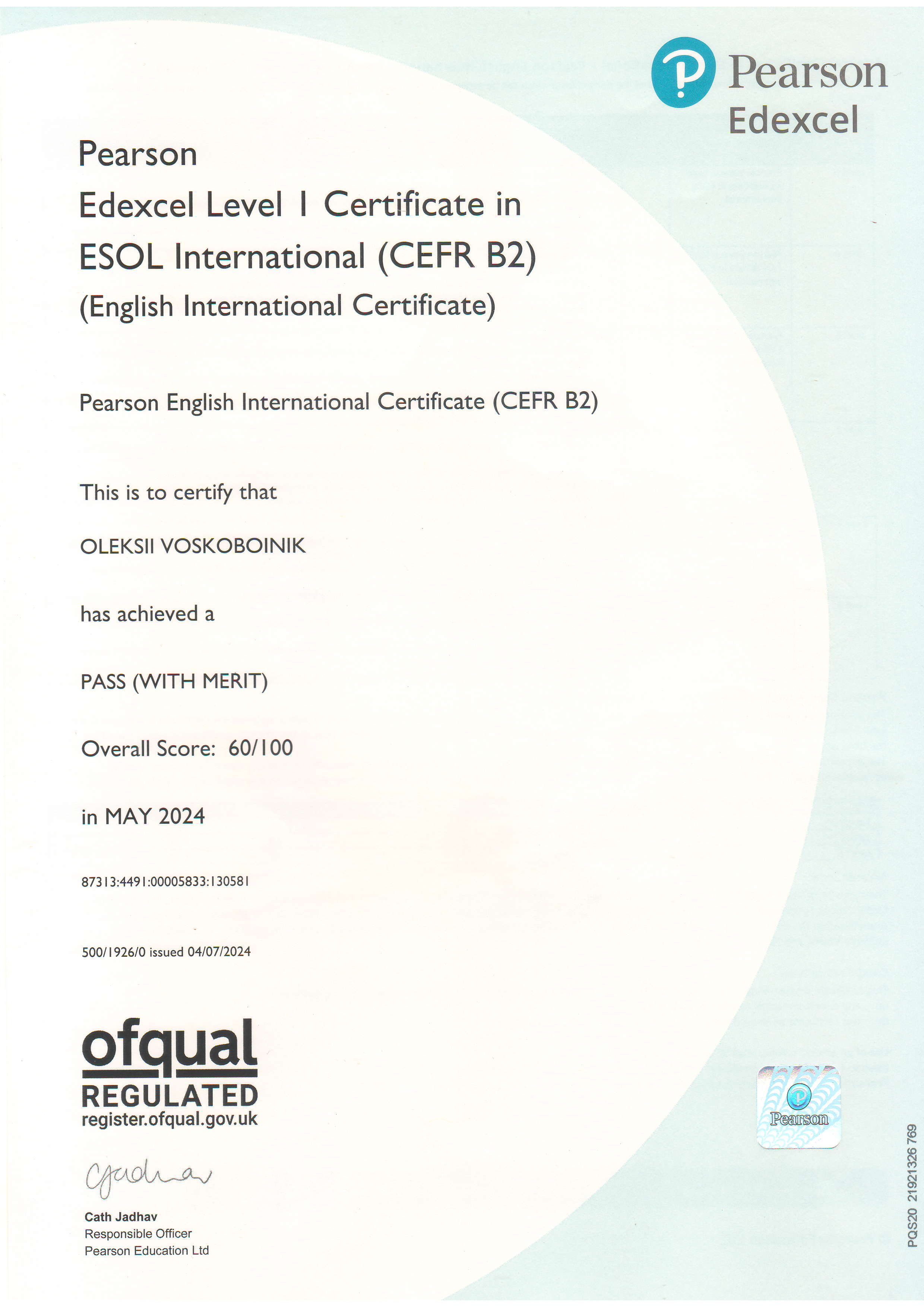 Професор Воскобойнік Олексій Юрійович отримав сертифікат В2
