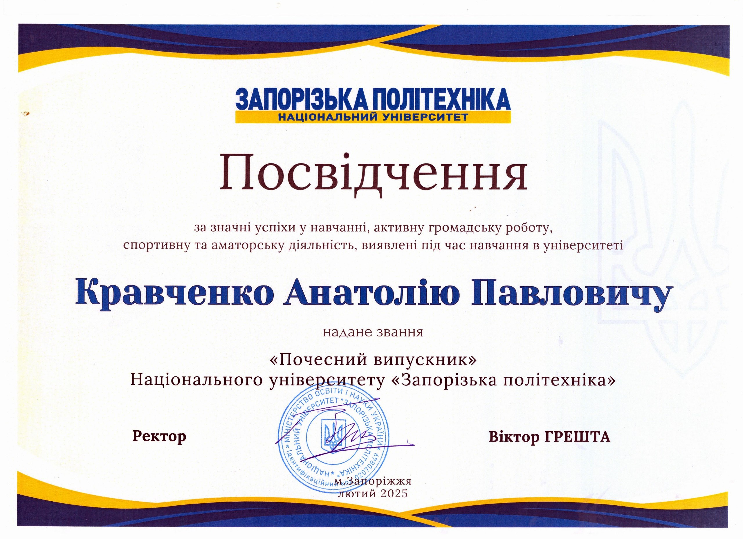 Випускник групи БАД-213м Кравченко Анатолій Павлович отримав звання “Почесний випускник” Національного університету “Запорізька політехніка”