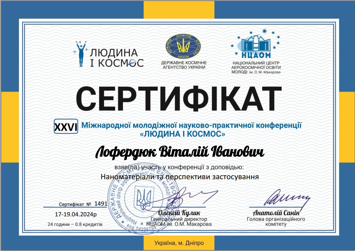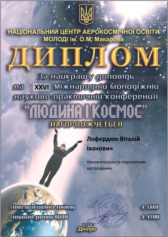 Лофердюк Віталій Іванович, студент групи БАД-212 був нагороджений за найкращу доповідь на XXVI Міжнародній молодіжній науково-практичній конференції "Людина і космос" (м. Дніпро) 2024р.