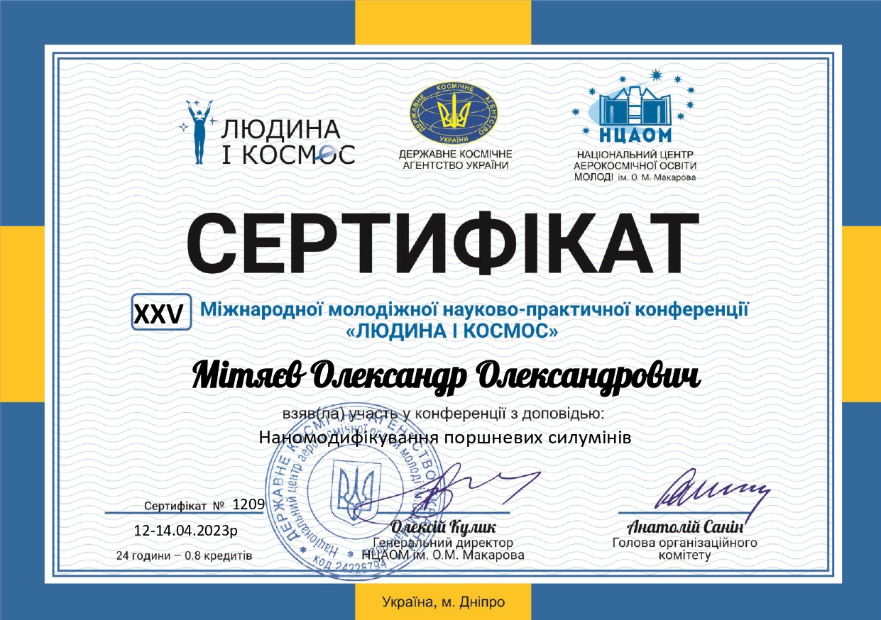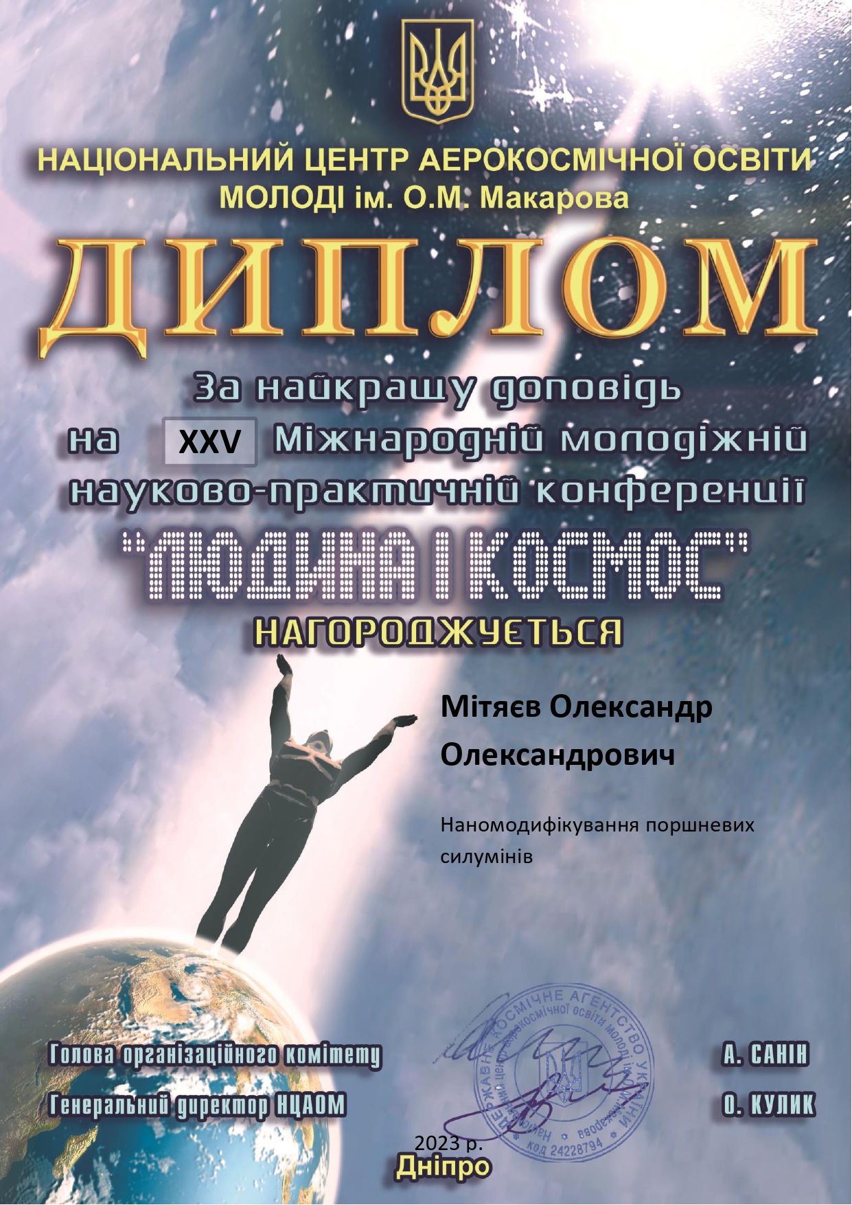 Мітяєв Олександр Олександрович, студент гр. БАД-212м у 2023 році за найкращу доповідь на ХХV міжнародній науково-практичній конференції «Людина і космос» (м.Дніпро) він був нагороджений дипломом.
