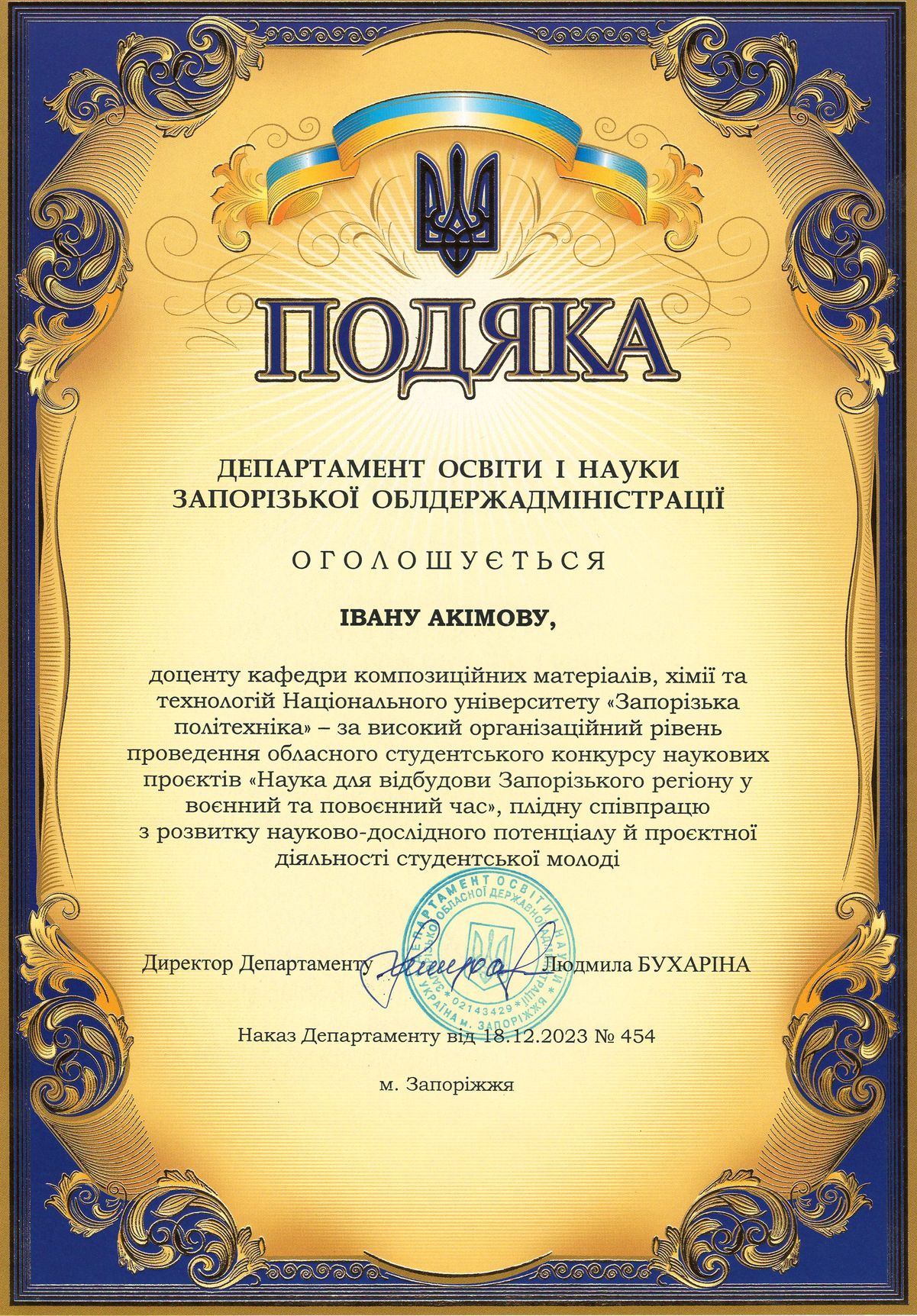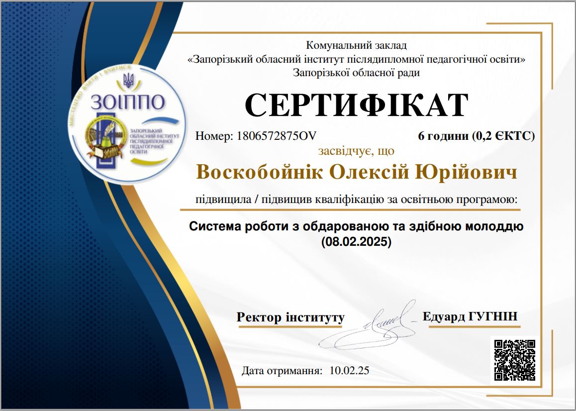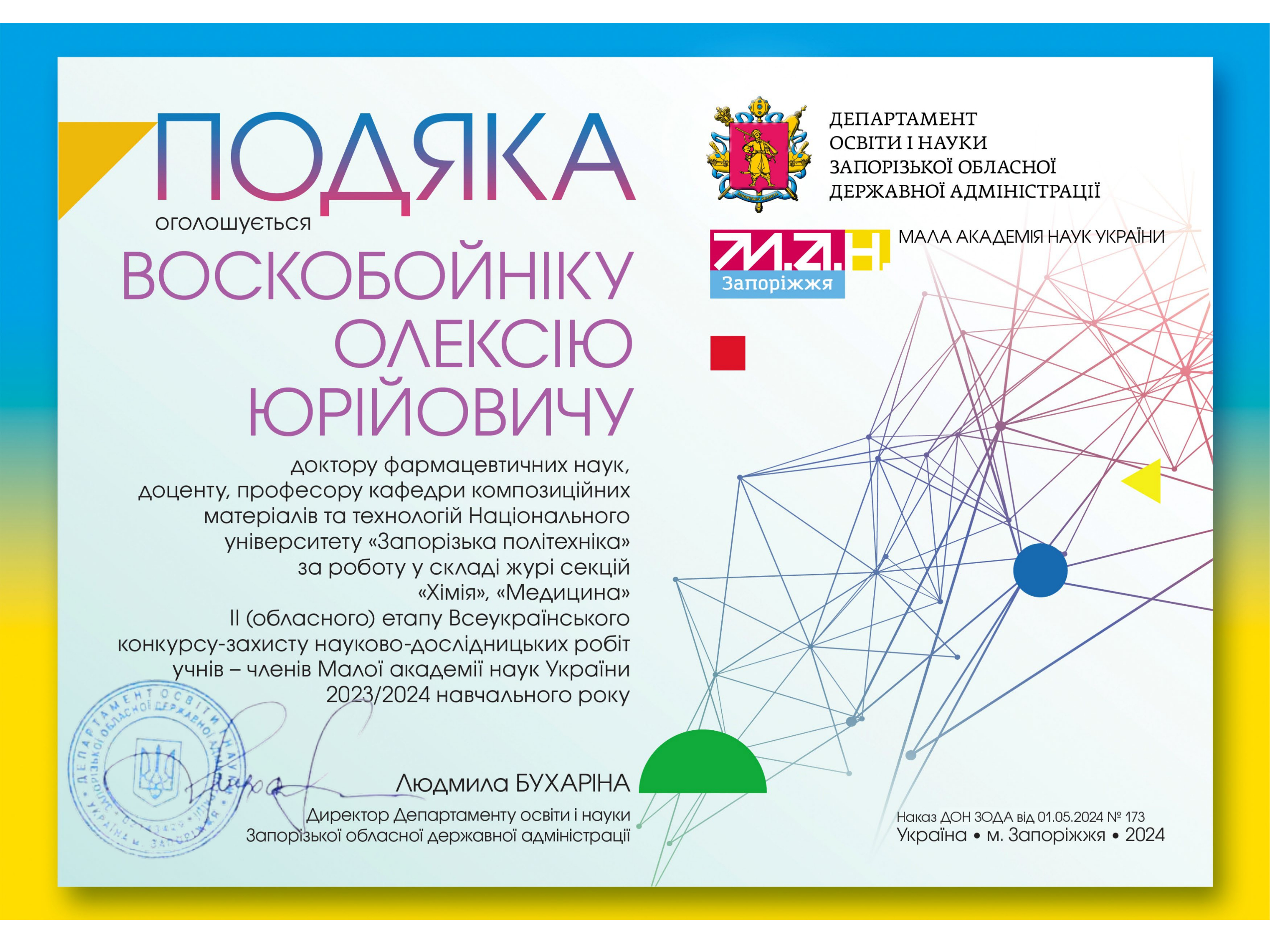 ВОСКОБОЙНІКУ ОЛЕКСІЮ ЮРІЙОВИЧУ доктору фармацевтичних наук доценту, професору кафедри композиційних матеріалів та технологій Національного університету «Запорізька політехніка» за роботу у складі журі наукового відділення «Хімія і біологія» ІІ обласного етапу Всеукраїнського конкурсу-захисту науково-дослідницьких робіт учнів – членів Малої академії наук України 2024/2025 навчального року оголошується Подяка.