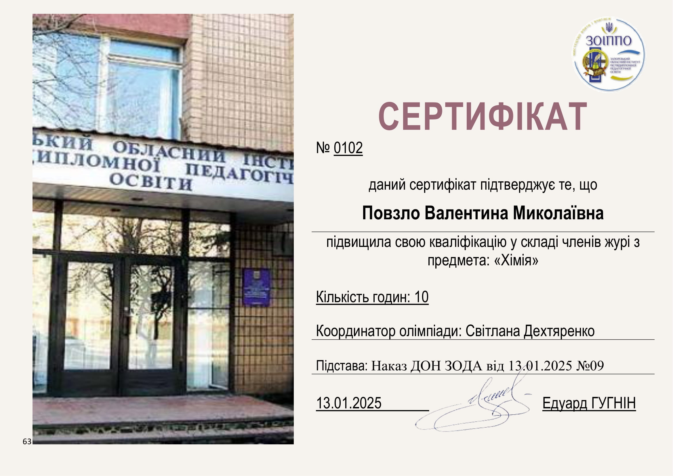 Старший викладач Повзло Валентина Миколаївна підвищила свою кваліфікацію у складі членів журі з предмета "Хімія"