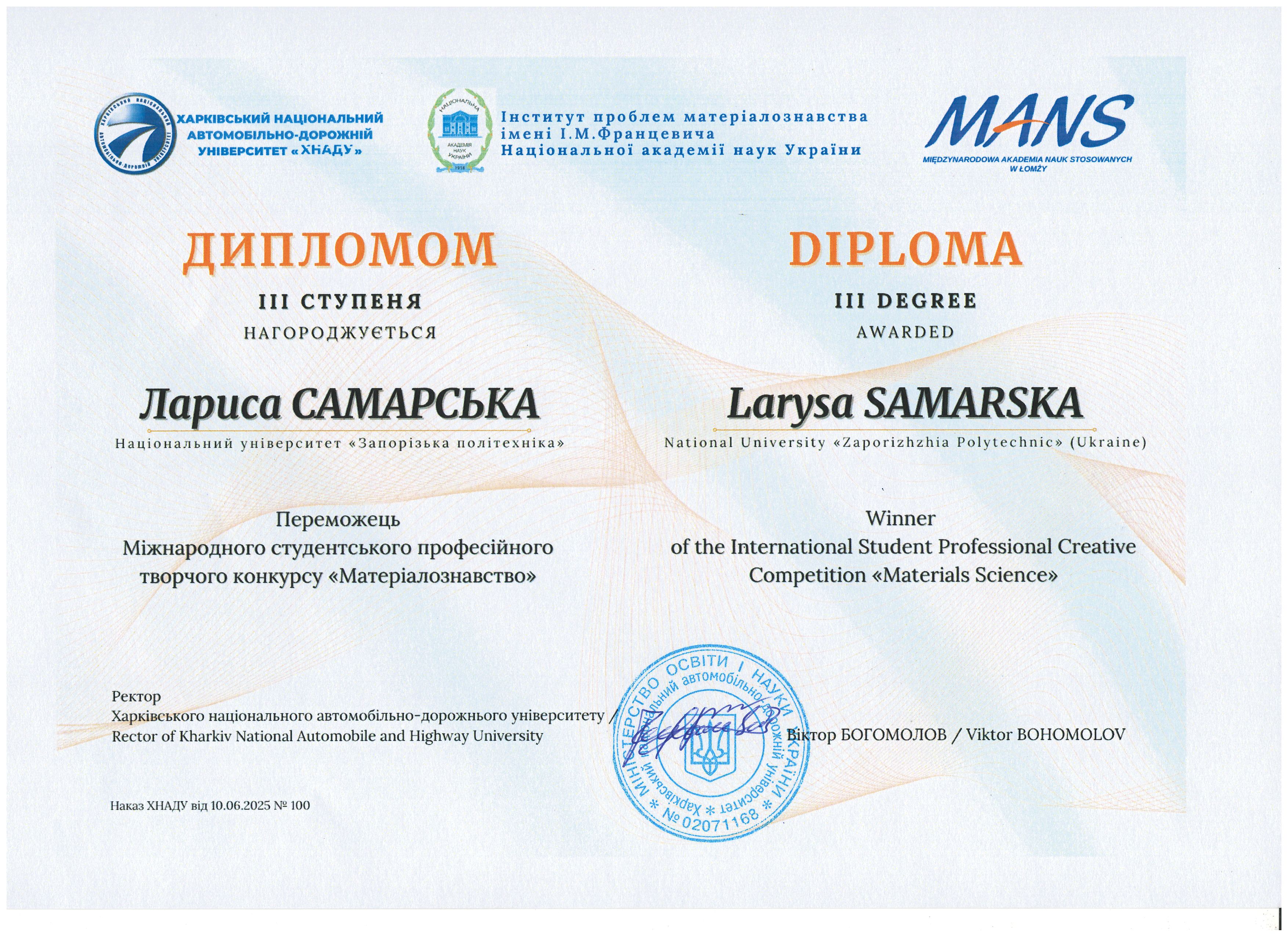 Студентка групи БАД-213 Лариса САМАРСЬКА нагороджена дипломом ІІІ ступеня за перемогу в Міжнародному студентському професійному творчому конкурсі "Матеріалознавство"