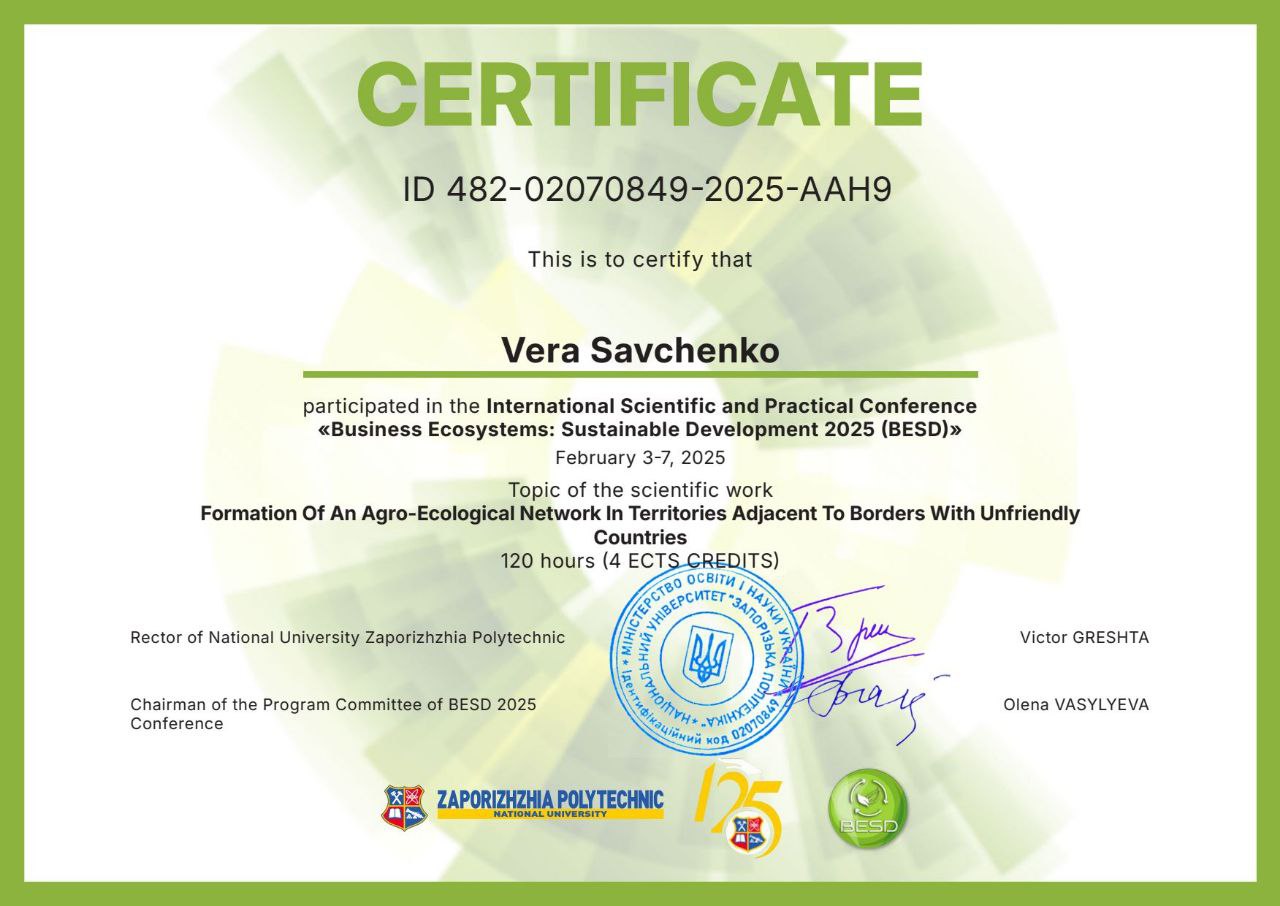 Доцент кафедри Савченко Віра Олександрівна прийняла участь в Міжнародній науково-практичній конференції “Business Ecosystems: Sustainable Development 2025 (BESD)” 3-7 лютого 2025 року