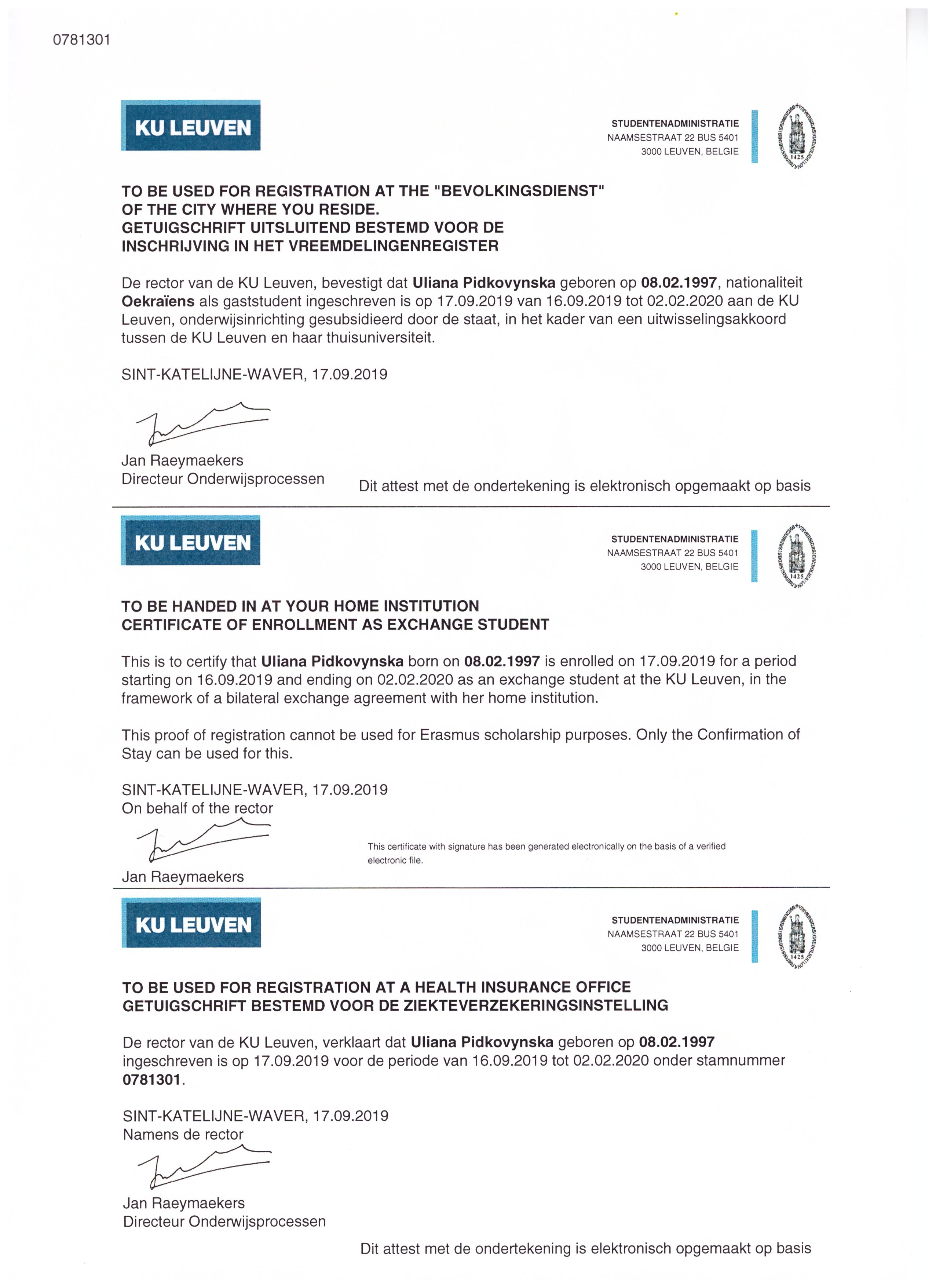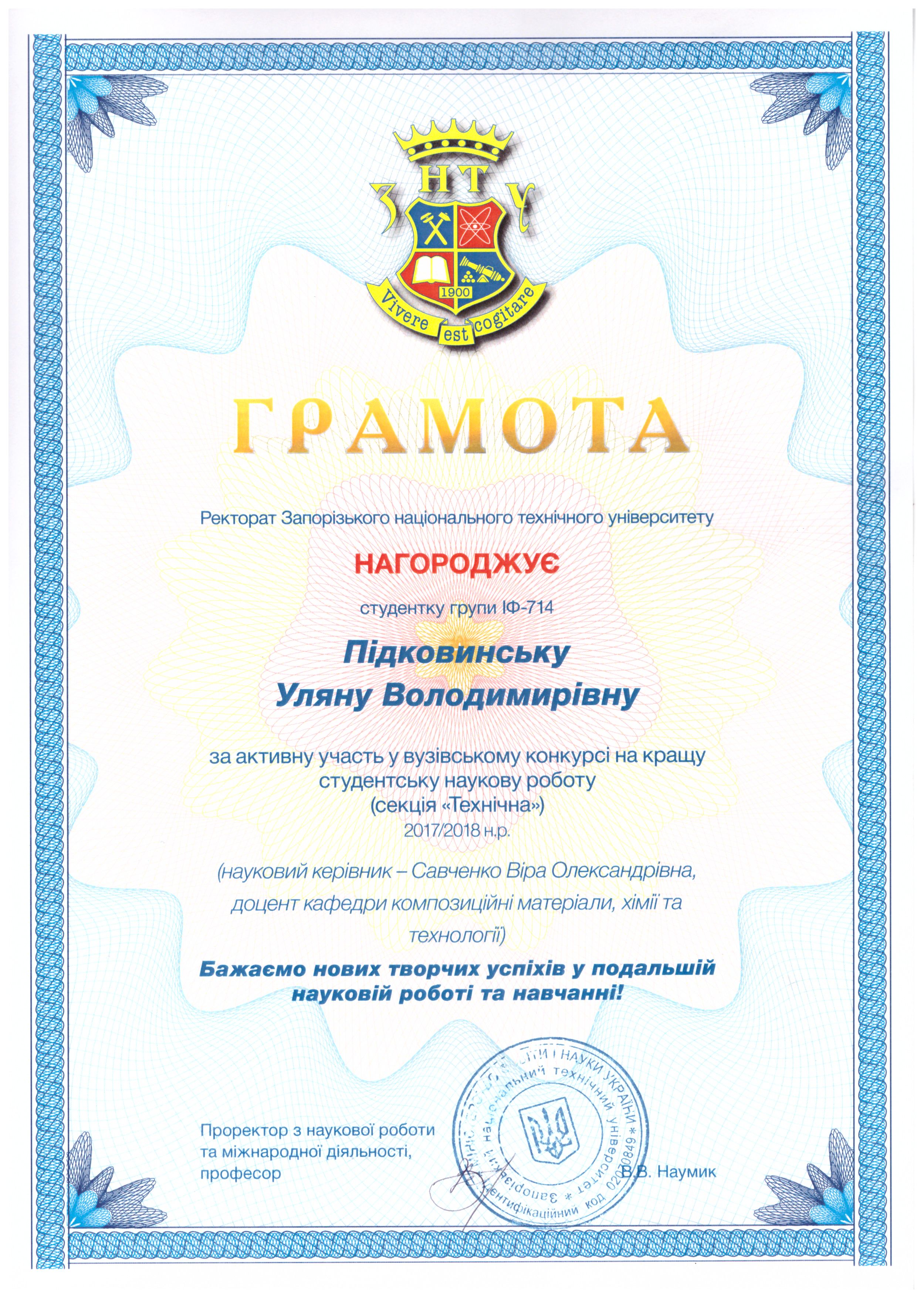 Магістр Підковинська У.В. наукове стажування пройшла у Бельгії та у 2020 році поступила до аспірантури за спеціальністю 132 «Матеріалознавство» (наук. Керівник д.т.н., проф. Волчок І.П.).