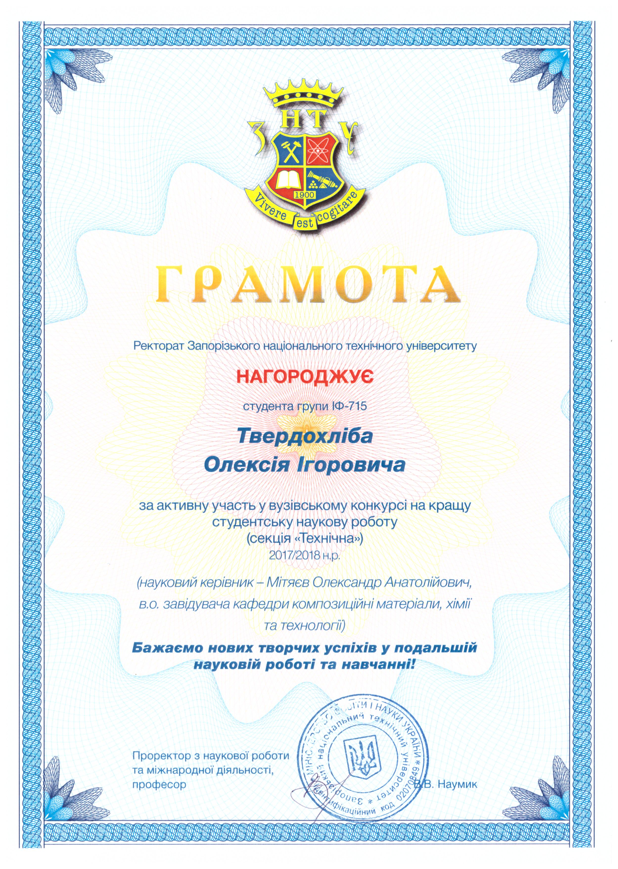 Лофердюк Віталій Іванович, гр. БАД-212 посів ІІ місце з науковою роботою «Вплив мікро- та наномодифікування на механічні властивості вторинних алюмінієвих сплавів» (науковий керівник Мітяєв О.А., зав. каф. КМХТ);